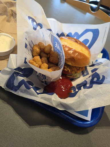 We went there after my grandson's Awards Ceremony for school. I had never been there before. They, my daughter and her family, love it because they can order off of the kids" menu and each order comes with two different free items on a paper stuck to the sack your food comes in. I would not have known anything about the outside paper for a free scoop of ice cream with a topping. You just have to take that half of the lpaper up to them and order it. I think it's nice that we can order small portions for people like me that don't order big meals. The food was very good. I had a two piece chicken strip meal with fries, a drink and my free ice cream. The chicken strip are HUGE! They aren't strip at all. They were very good. I use Buffalo Wing Sauce to dip just about anything in and they had that for me too. A lady came by and asked if everything was good and if we needed anything. The lady that waited on us behind the counter came out also a little bit after the other lady to see if we needed anything too. I was impressed with the place because I didn't know...