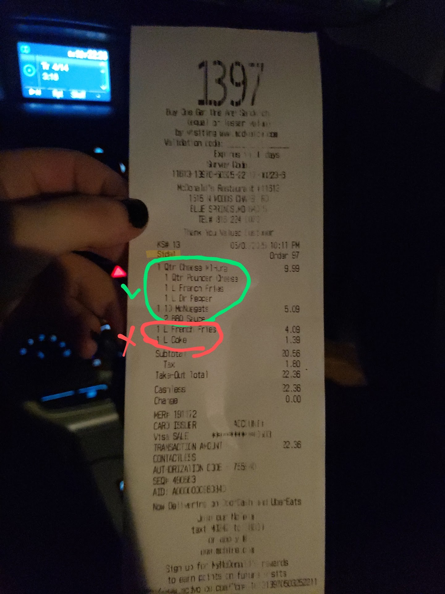 Read moreDrive thru… ordered small hamburger, 10 piece chicken nugget, small coke. Got to window receive medium Diet Coke, cheeseburger, the nuggets and French fries I didn’t order. I gave the Diet Coke back and told the girl I had fries. They gave me the bag anyway. She didn’t want the fries back. I waited for the replacement Coke. Manager told me I didn’t order a Coke. I told her but I did matter of fact I was even was given a larger one than I order but gave it back to the girl bc it was at Diet Coke. Yes but that was a mistake. She told me 3 times I needed to drive around the building and reorder the Coke. By Now there are 10 cars behind me and I have to pick up granddaughter at bus stop. I was not happy I finally told her here I will give you your fries back that I didn’t ask for and you can give me the Coke I did ask for. I should not have to go around and be late or go without because a silly little error on their part. She took the fries and walked away with a look on her face. The girl came back and gave me my drink. All for one small drink. I apologized to the young girl but the...