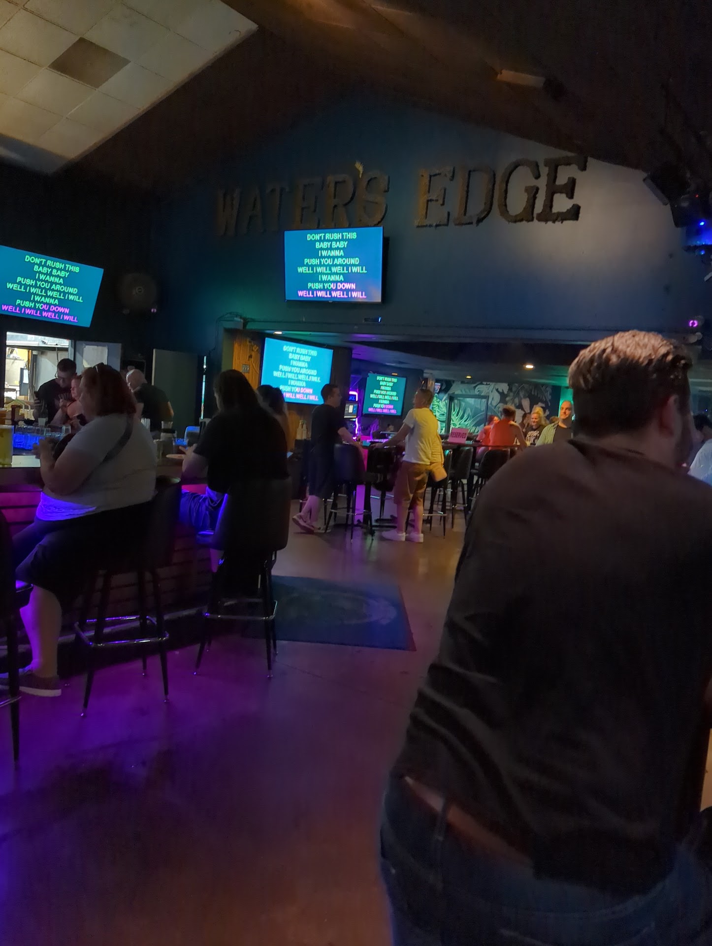 The resturant/bar itself was pretty large and had a cool vibe to it. I enjoyed the fact that there were so many bathrooms. I can't speak to the patrons being friendly or not because i was fighting for my like to breath due to the smoke. I will say that the only person I interacted with other than the bar staff was the KJ. He was very rude from the beginning, which was confusing to me. Considering that's the entire reason I decided to try Waters Edge in the first place.