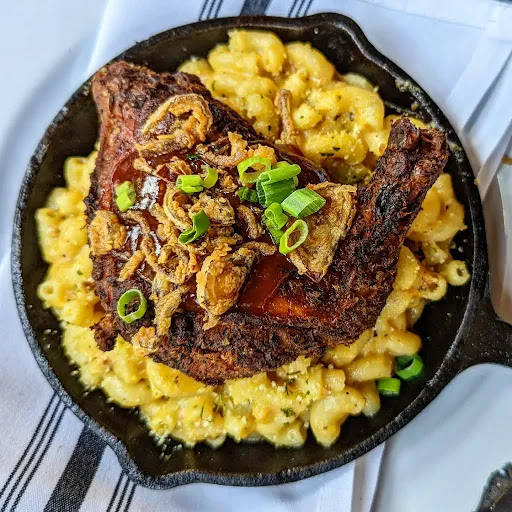 Finally, the special; a smoky, lightly breaded and incredibly juicy and flavorful chicken leg over a skillet full of macaroni and cheese, drizzled with a house bbq sauce and finished with crispy shallots - southern cooking elevated to absolute heaven.