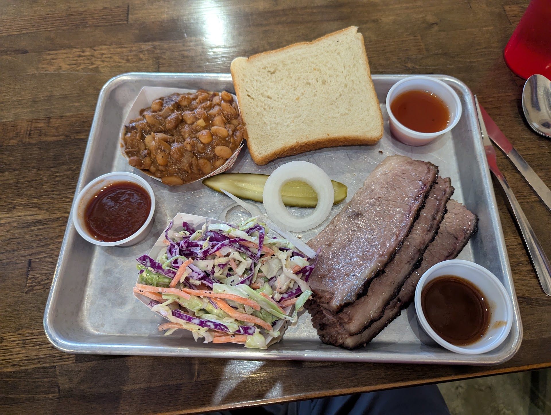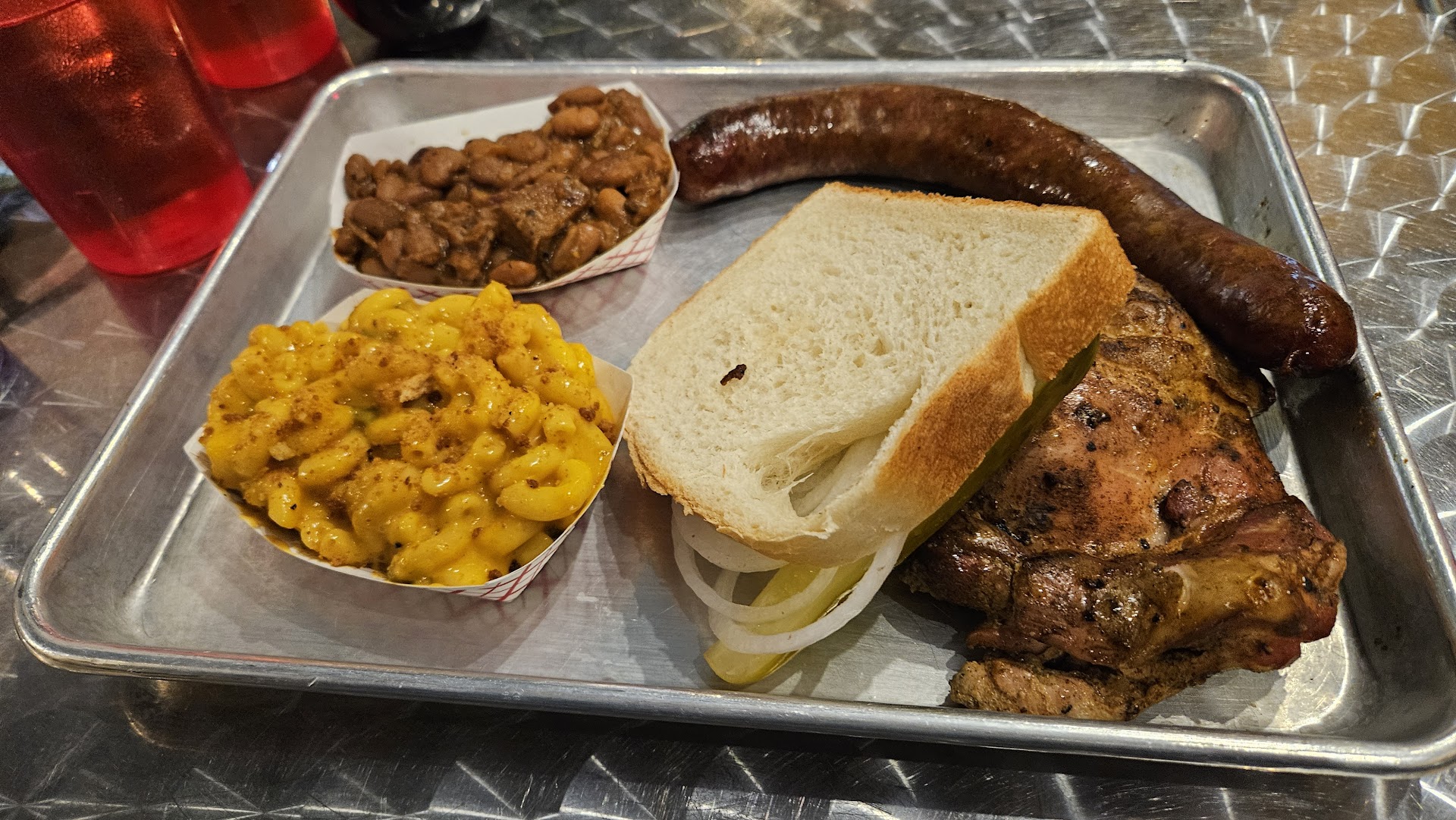 Read moreThis delightful and simple restaurant is a nice place to stop for a solid meal. The star of the dishes, which are the meats, were absolutely delicious. Perfectly cooked and well seasoned/flavored. One does not even need the bbq sauces for added flavor because it's there. The sauces overall were good. The Carolina sauce is a bit too vinegary and watery. The house sauce was delightful. The sides were fairly underwhelming. We had bbq beans, the mac n cheese, slaw, and the cornbread. The bbq beans were really good, but the other three were not at all special. The slaw was bland, and the mac n cheese seemed to be a salsa verde mixed with a basic mac n cheese. The cornbread was objectively cooked well, but even with the special jalapeño jam, it was just okay. The meat stands out for sure as being excellent. I have traveled across America and have tried bbq from North Carolina to California and every state in between. The meat is legit, so that is a great positive. In terms of service and atmosphere. The service is basically a self-serve of everything but the tray of food. The customer picks their food up and takes care of everything themselves. Servers, however, do come and check on everything regularly, which was nice. The atmosphere was good, but the restaurant was so air-conditioned that our food cooled with 15 minutes of getting it. My wife and I can deal with that without much issue, but this could be an issue with other guests. Overall, I think everyone should stop by if traveling through. The meat is...