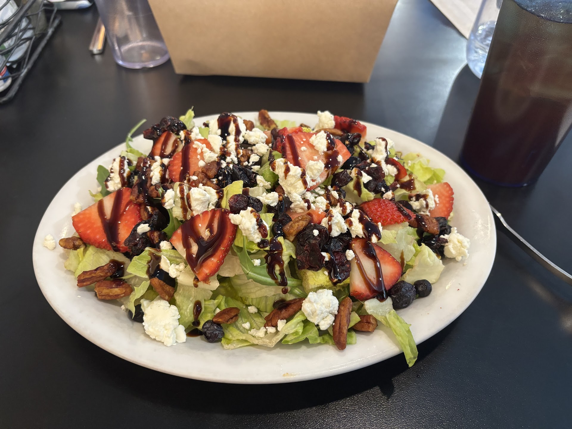 It took 15 minutes for us to just get our drinks. I asked about our salads & she said they would be a few minutes (now I've worked as a server, salads are generally the first things up in the window & take less than a minute to throw together). In the meantime she casually starts bussing tables and chatting with a fellow coworker. I politely ask about our salads & she apologized and said they would be out in a minute. That minute was an additional 15 minutes because she started bussing a table of 10 at the back. We finally got our salads but didn't even take one bite before our meals were brought out. Not happy!