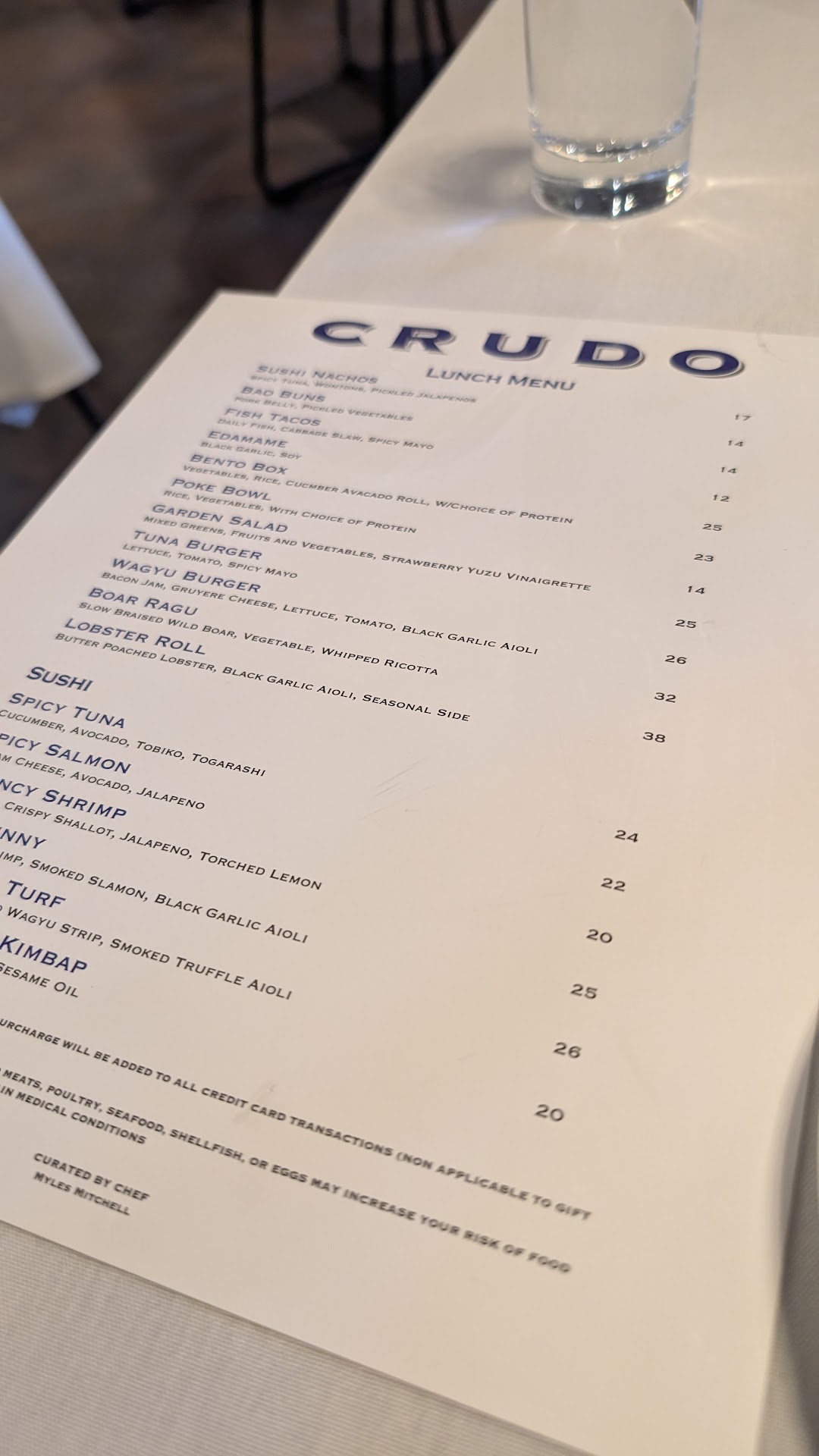 Crudo isnât just a restaurant â itâs an experience. The food, service, ambiance, and drinks are all 10/10. If youâre thinking of visiting, donât hesitate. Weâre already planning our...