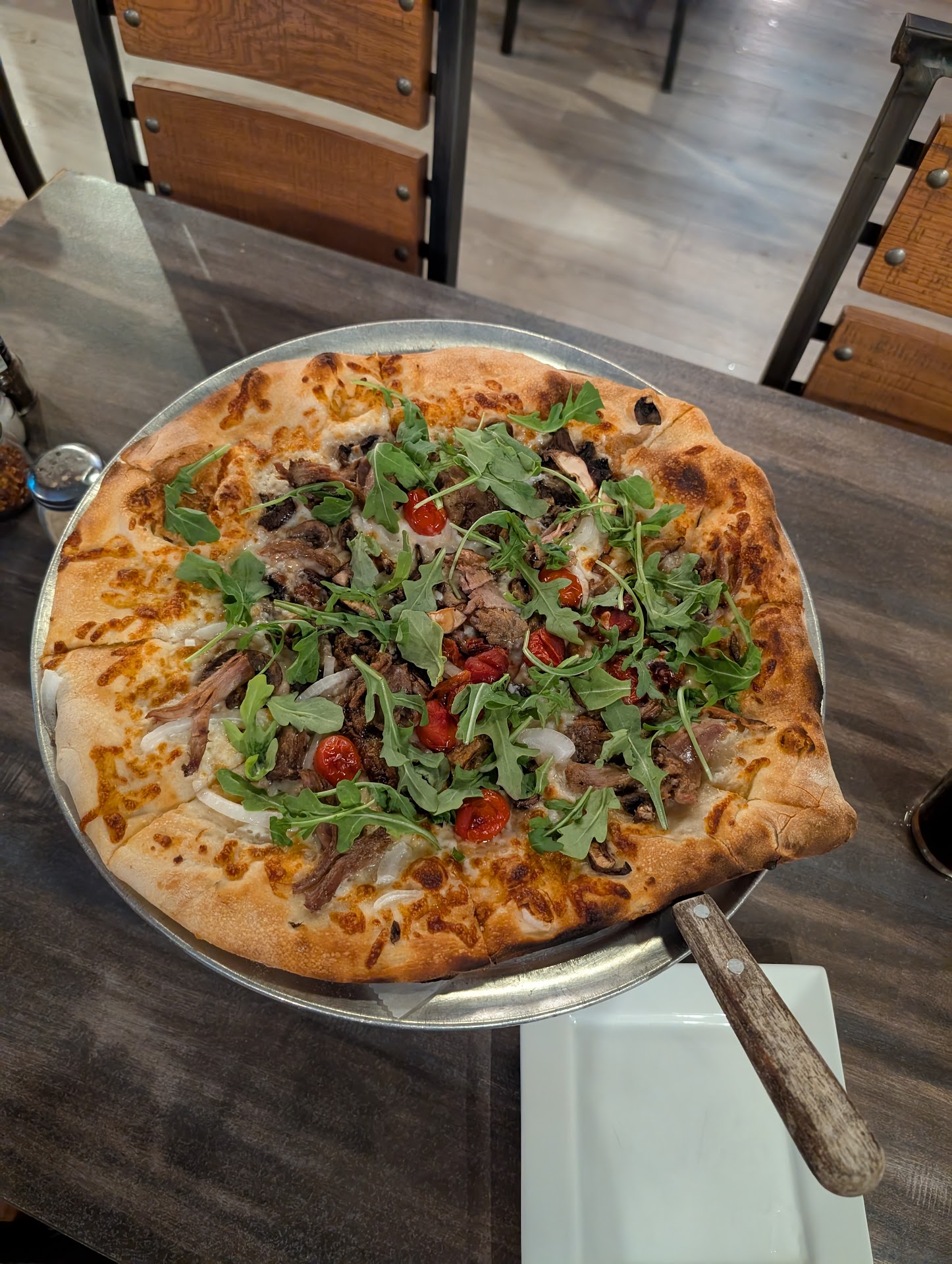 Service was a bit slow. I waited a solid hour for my pizza. The staff was polite and kept the drinks coming. It's pretty loud. Even with the place half empty it was almost too loud to have a conversation. The roof is fairly echo prone and it amplifies the sound quite a bit.