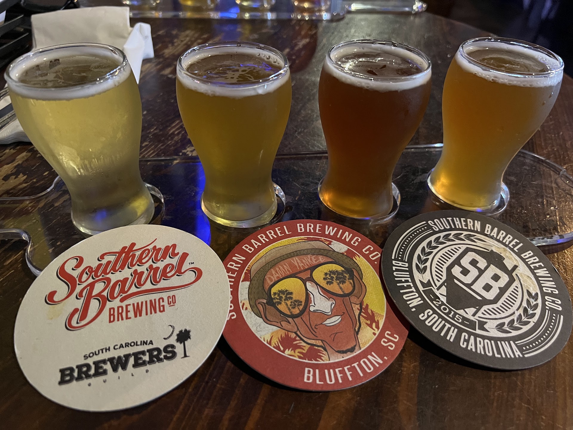 My wife and I were in Port Royal visiting Shellring Ale Works (excellent!) and we decided to detour over to Bluffton and visit Southern Barrel because my wife is a big fan of their Wild Bramble sour. Iām trying to be a little sympathetic in my review because clearly something was amiss with the staff. My wife is allergic to strawberries and when she asked our waiter if two of the fruited beers had strawberry he responded, āI donāt know, and I doubt anyone else here knows either.ā Then we overheard the bartender tell another patron in response to their question, āI donāt know. I donāt really drink beer.ā Both of these responses fail for a response when you are a local brewery. Also we were sitting close enough to the kitchen to see that they were on the verge of a mutiny. Two kitchen staff walked out while we were there. I get that restaurants have bad days. I just couldnāt tell if our waiter was moving around with frantic understaffed energy, if scattered energy is just his vibe, or if he was disinterested. At one point I needed more napkins and when he brought them over he never even broke stride as he dropped them on our table.