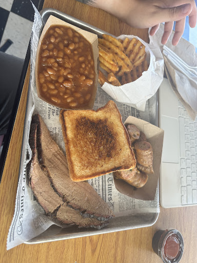 Read moreWe had the ribs platter and burnt ends platter with coleslaw, fries, baked beans, and Mac and cheese with peach cream pie for dessert. Everything was excellent! Ribs fell right off the bone and burnt ends were big, tasty, and tender. Although the Mac and cheese was a bit average which was perfect for my one and 3 year olds who also loved the beans and fries respectively. Would have been nice if they had told us about the baby chairs around the corner which we only found once meal was mostly gone when toddler had to find the bathroom. Plus the room was pretty hot from afternoon sun (and wrangling a 1 year old determined to feed himself baked beans and Mac and cheese before said high chair was procured) 😅 Would go back immediately to eat everything again, especially the peach cream pie 🤤 mmm and that spicy coleslaw and extra crispy waffle fries... Yep, everything, and I'd douse that bland Mac and cheese with the awesome Classic BBQ sauce they have on the table and I...