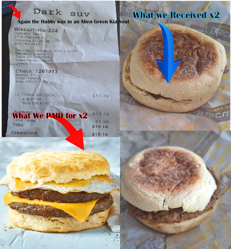 Well after being the last served, my husband got home to find, 2 Dry, un toasted English muffins, No eggs, no cheese and nothing else, Here's the Kicker.. Even the Ticket on the Order they gave him Reads "DARK SUV" my husband was in a Alien Green Kia Soul!