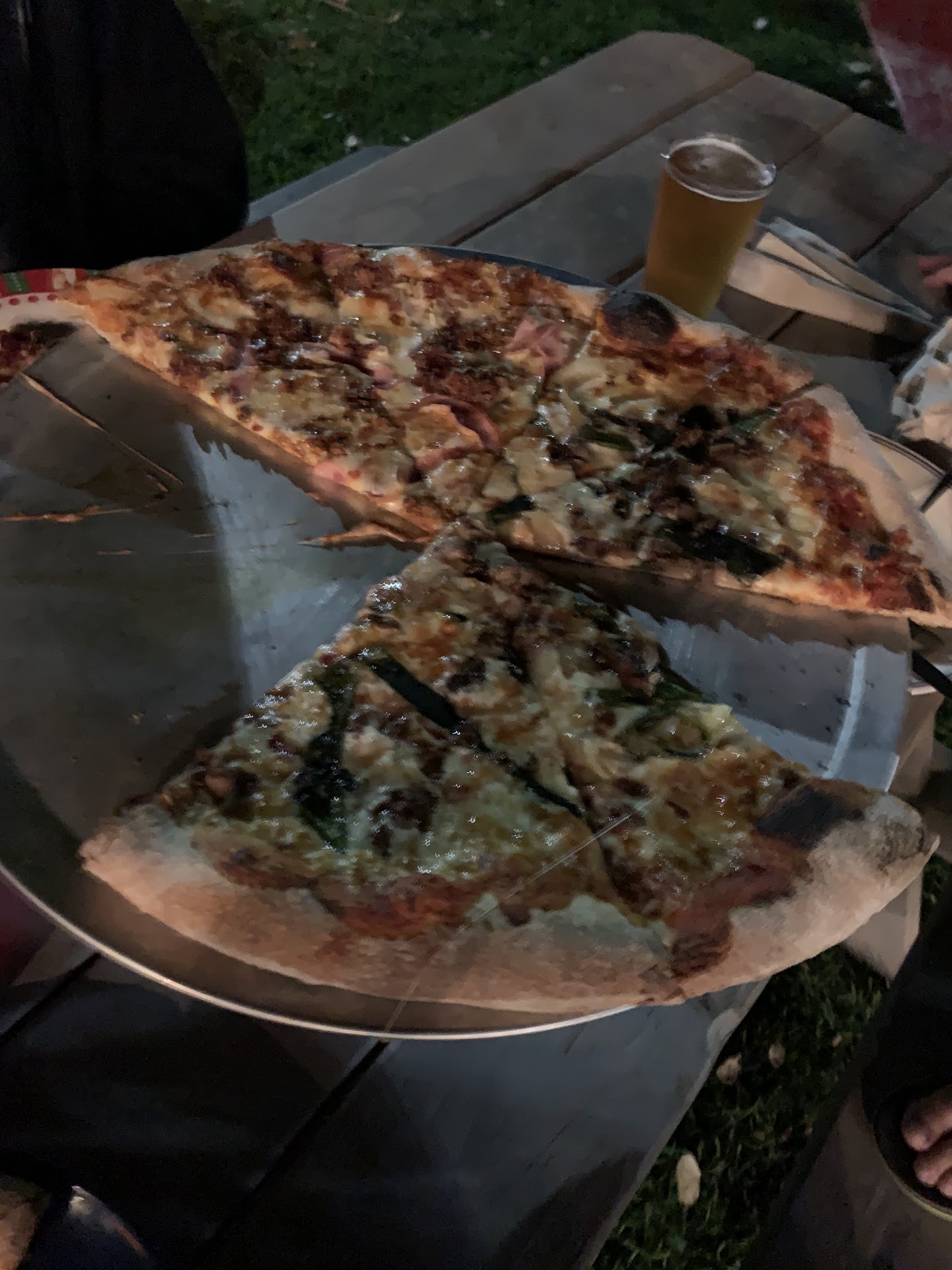 Great local brewery with excellent pizza options. We went on a Sunday night for dinner. We called ahead to make a reservation because we had a party of 12 including 4 kids (6 to 10 years old). We arrived right at 5:45pm and they had a table set up ready and waiting. We ordered waters all around and then drinks. Most got beer but 2 ordered cocktails. The cocktails took a little longer because the 2 ladies behind the bar were not old enough to make mixed drinks but old enough to serve beer. Our server was the only one old enough that night to serve liquor so it took longer for him to get a chance to make the cocktails. We were able to order soon after and the food arrived in a decent amount of time. Kids meals were first, followed by 5 pizzas and then 2 pasta dishes. Everyone agreed all of the food was amazing. Pizza was really good. They only had 2 sizes and the small pizzas would be enough for 2 people if they weren't super hungry. They only had 3 of their own beers on tap and the rest were from other area breweries. All of their own beers were pretty good, we all enjoyed them. Along with rotating tap list they do offer a full bar. The atmosphere was nice and clean. They renovated the old train depot and it was a cool space. They also have a huge outdoor space with yard games available to play. The kids had plenty to do outside once they ate their food while waiting for adults to finish. We appreciated all the large windows facing the yard to keep an eye on the kids from inside. Staff was kind, friendly and professional with an aim to please and create an enjoyable experience. Not sure we'll ever be back to Boardman since we were just passing through for the night but if we are, we'll definitely go back! It was a great dinner,...