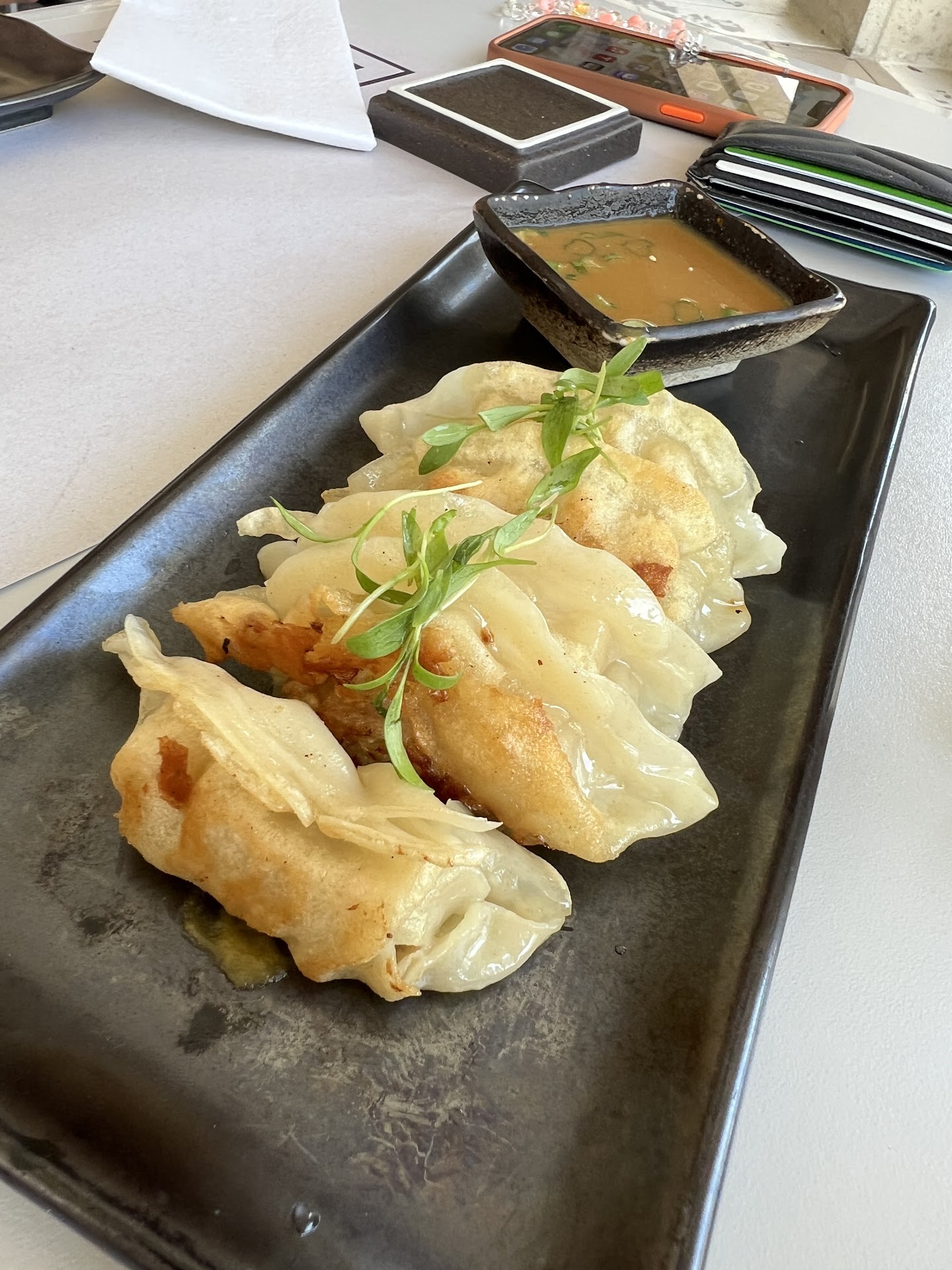 We wanted to try as much as possible, so we leaned on our server for recommendations—and away we went. First up: hot green tea, fried pork gyoza, and edamame from the happy hour menu. The gyoza was perfect—crispy edges, steamy goodness inside, and the ponzu dipping sauce was the cherry on top. The edamame was fresh, perfectly salted, and the ideal warm-up.