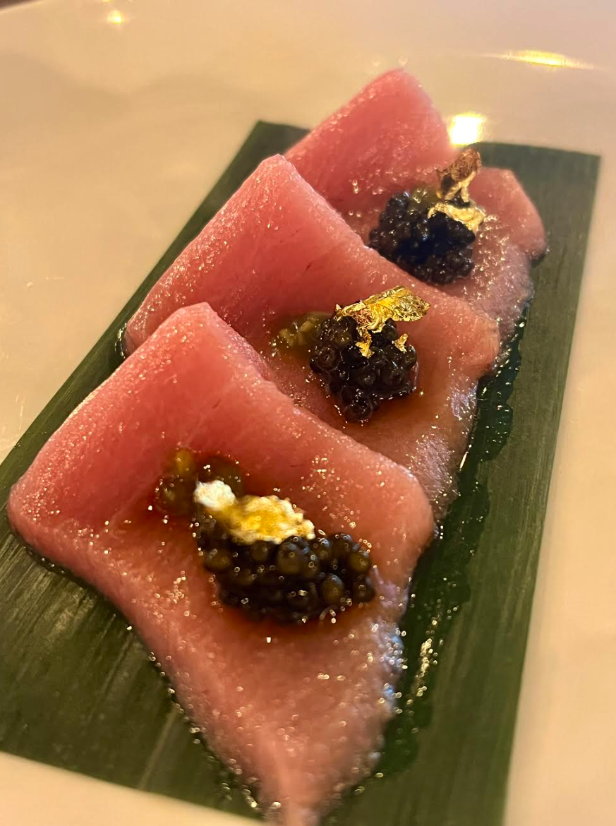 Next came the honey almond shrimp. Yes, you read that right—honey almond shrimp. Sweet, crunchy, savory perfection. They even offer this in roll form, which I’ll definitely be back for. We devoured every piece and practically arm-wrestled for the last one. Then the chef sent over tuna ceviche tacos—lemony, fresh, with avocado and greens but with tuna as the clear star. I literally did a happy dance at the table after the first bite.
