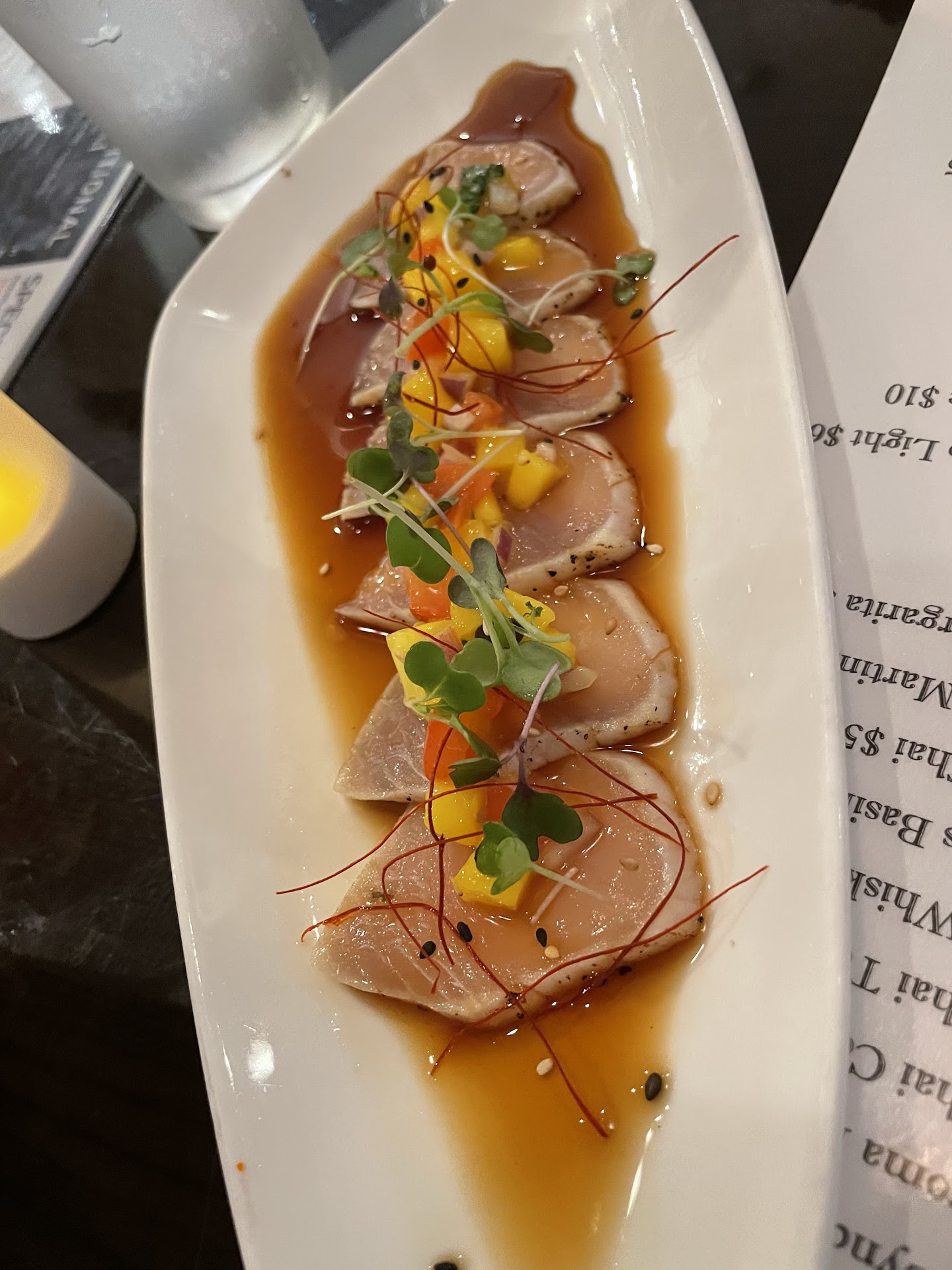 Everything we ate was amazing. The crispy duck with its fantastic sauce, the incredible Pad Thai, the tasty tuna appetizer, and the delicious miso soup were all top-notch. Of course, we had more incredible sushi and an amazing homemade coconut dessert. My cousin was very impressed and loved both the sushi and the Thai food.