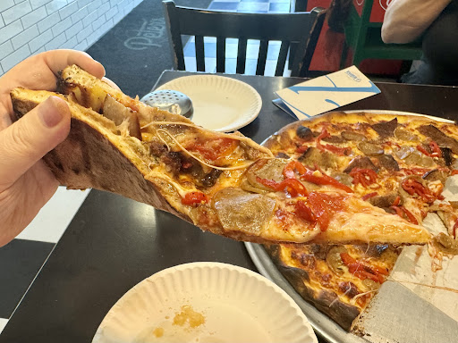 We ordered a slice of the Grandma pizza, which was fantastic, and decided on the sauce we wanted on our 18-inch Brooklyn-style pizza. We went with marinara sauce, sausage, fried eggplant, and roasted red peppers, and it turned out to be one of the best pizzas I've had in a long time. We also asked for it to be well-done and were not disappointed with the result. The pizza was fully cooked with excellent crust blisters and a well-spotted underskirt.