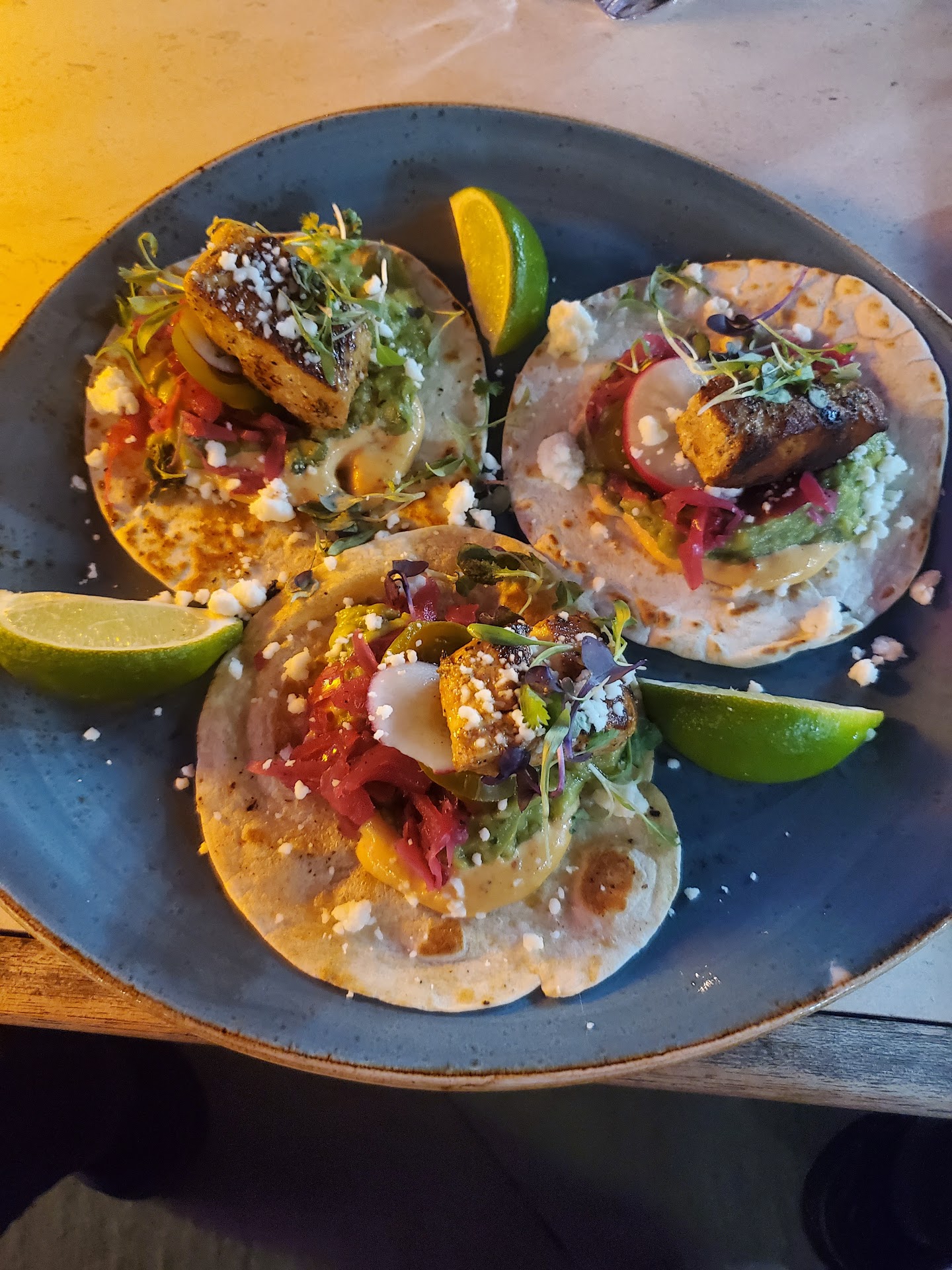 Walked in the front door of the lobby of the hotel, which looks fabulous. Three people behind the desk never even said hello. Good evening whatever. Went to the outside bar to meet a friend. 11/14/22- Waited for the two bartenders to acknowledges us. We all ordered a couple of drinks I ordered the edamame hummus which came with non-bread a couple of. I believe they were English cucumbers. It looked delicious . I also had a chicken grilled chicken sandwich was nice the bread. Hubby ordered the fish dip , our friend order the basic burger w/ FF. 1/13/2025- we sat our selfs. Waitress brought over our menus . Plus 2 glasses of water. We ordered drinks first I asked for a drink that needed to be in a sniffer. They do not have sniffers so they put my 4 ounce liquor in a small champagne glass. A little disappointing. We shared the hummus, which was nice. Had a whole chickpeas in it as well the vegetables that came with it OK .Only problem is all the Nan bread was dipped into the hummus itself so who doesn’t like hummus couldn’t eat the bread unless they cut it off. I’m sorry I did didn’t get our waitress’s name because she was patient, professional, and very sweet.