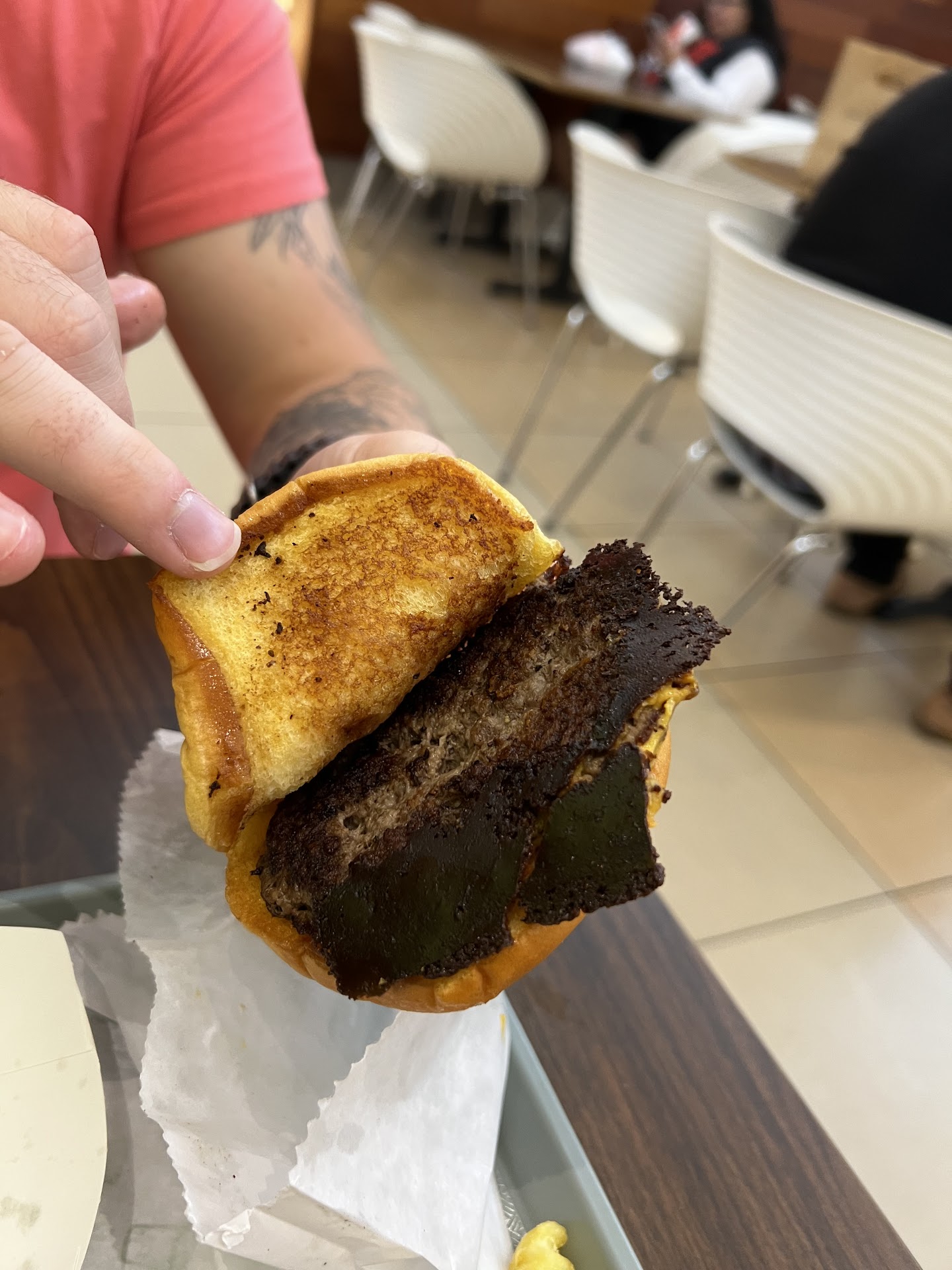 Me and my husband had ordered dinner her through the kiosk. It took about 10-12 minutes to get our food but we knew it was busy. Once I received my food I looked at my grilled cheese and it was like a burnt pancake. I didnât take a picture because I was just going to let it go and ask for a new one. The second I walked up to the counter I was ignored. 1-2 minutes went by until I had to get the managers attention myself. The second I showed her my grilled cheese she spoke very loudly and said âJust throw it away! Just throw it away!â I work in customer service and that is no way to respond to a customer especially a paying one. So Iâm waiting another 10 minutes at least and not once does she ask the back where the grilled cheese is until right before itâs handed to me. I asked for her name because I thought it was very unprofessional how she handled the situation. âTanya.â Then I go back to the table to my husband who shows me one of the burgers, may I remind you we also received 2 single burgers instead of the double cheeseburger he ordered. Also she didnât even care to ask to replace my root beer float that was no longer that once I returned to my seat 13-15 minutes later. I have attached photos as well. Not a good presentation one bit. This is the worst shake shack we have been to, to say the least. Terrible service....