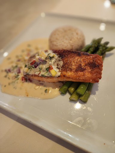 In Boca Raton fleeing the latest hurricane and found this accessible restaurant featuring Caribbean dishes. Conveniently located in the Boca Raton Marriott. Fried plantain chips with garlic aioli is a great appetizer. Followed with the salad with candied pecans and mango offering a great fusion of southern flavor and island fruitiness. The ample portion of salmon with mango salsa, asparagus, and rice filled our choices for tonight. Enjoy! The service was excellent. Would have had 5 stars but the asparagus I really prefer al dente. We shared these plates and it was a good choice as the portions are generous. Came back today for another dinner. Started with the chicken empanadas with cilantro salsa. The salsa was.excellent and a bit of heat, picoso. Next time I think I would try the beef empanadas because of the texture of the chicken. Next the burata salad was a real pleaser with a soft burata cheese and balsamic vinegar and garlic cloves. We finished with the Florida grouper, asparagus, and potatoes. The blackened flavor and the sauce on the grouper make a nice combination. The mashed potatoes are just like my homemade from scratch. The asparagus was closer to al dente tonight and makes miss my asparagus garden in NC. Ken and I shared this nice meal again and the portions were generous and ample for both of us. Service was excellent again, this time our server was Tony. Third night here on Boca Raton. We are starting with truffle fries and the jerk wings. The parmesan sprinkled on the fries makes them even more tasty. The jerk wings were flavorful as expected Tonight we will skip the salad and enjoy escabeche for the main dish. The sauce was very flavorful and a nice surprise with the baked chicken. Our friendly server tonight...