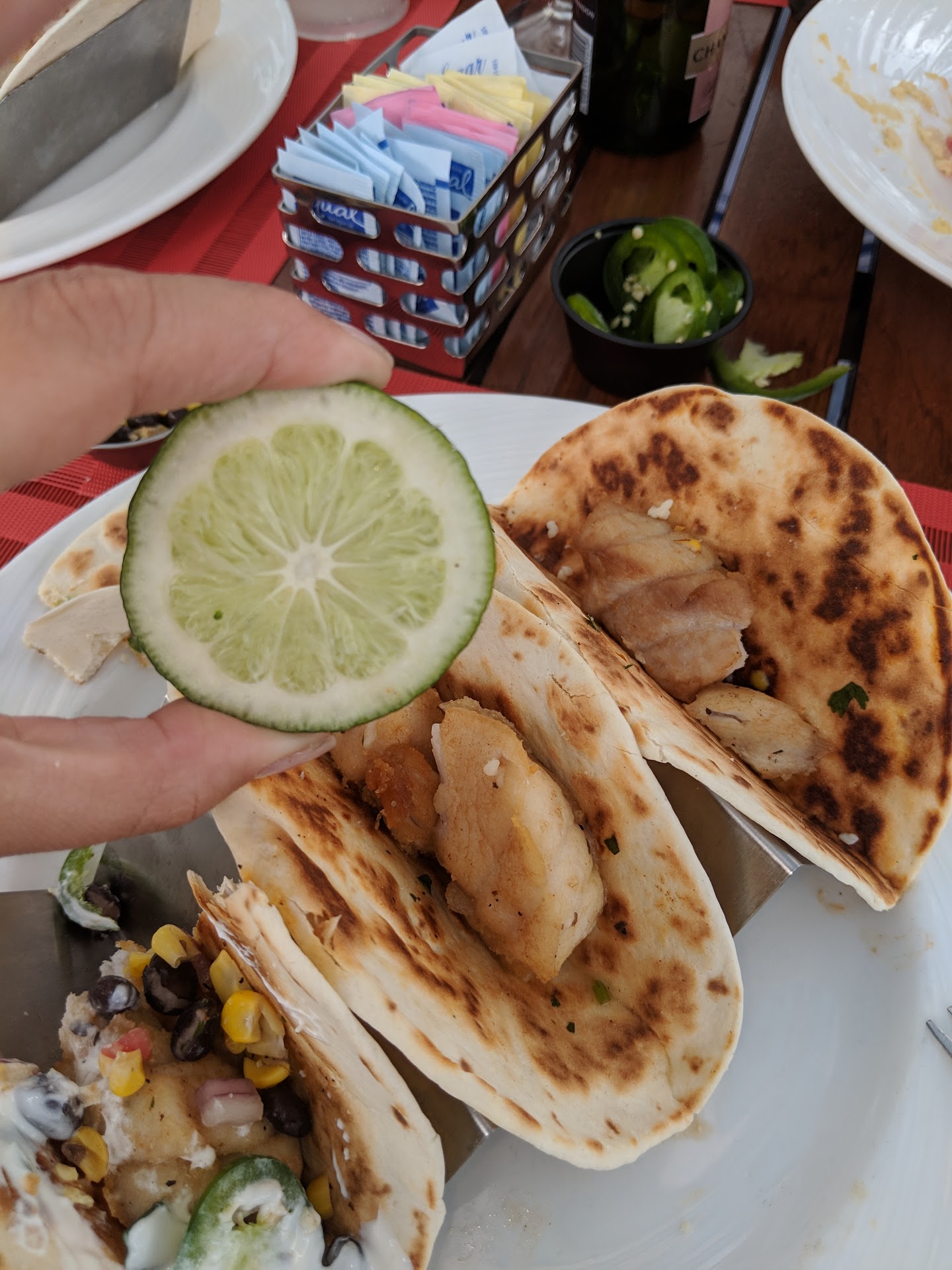 All 3 people in my party ordered the blackened fish tacos based on our waiter's recommendation, we requested truffle fries instead of regular fries. The tacos were nothing more than a burnt tortilla with a few pieces of fish which was not blackened. It was pathetic looking. A side or corn/bean salsa and a side or what the called 'limey cilantro crema' however, this was more like 99.9% sour cream and a few leaves of cilantro. I complained about the fact that the fish was not blackened, it was taken back and I got what now looked like deep fried fish, however, no still sign of it being blackened. The limes served on the side where dry as rocks.
