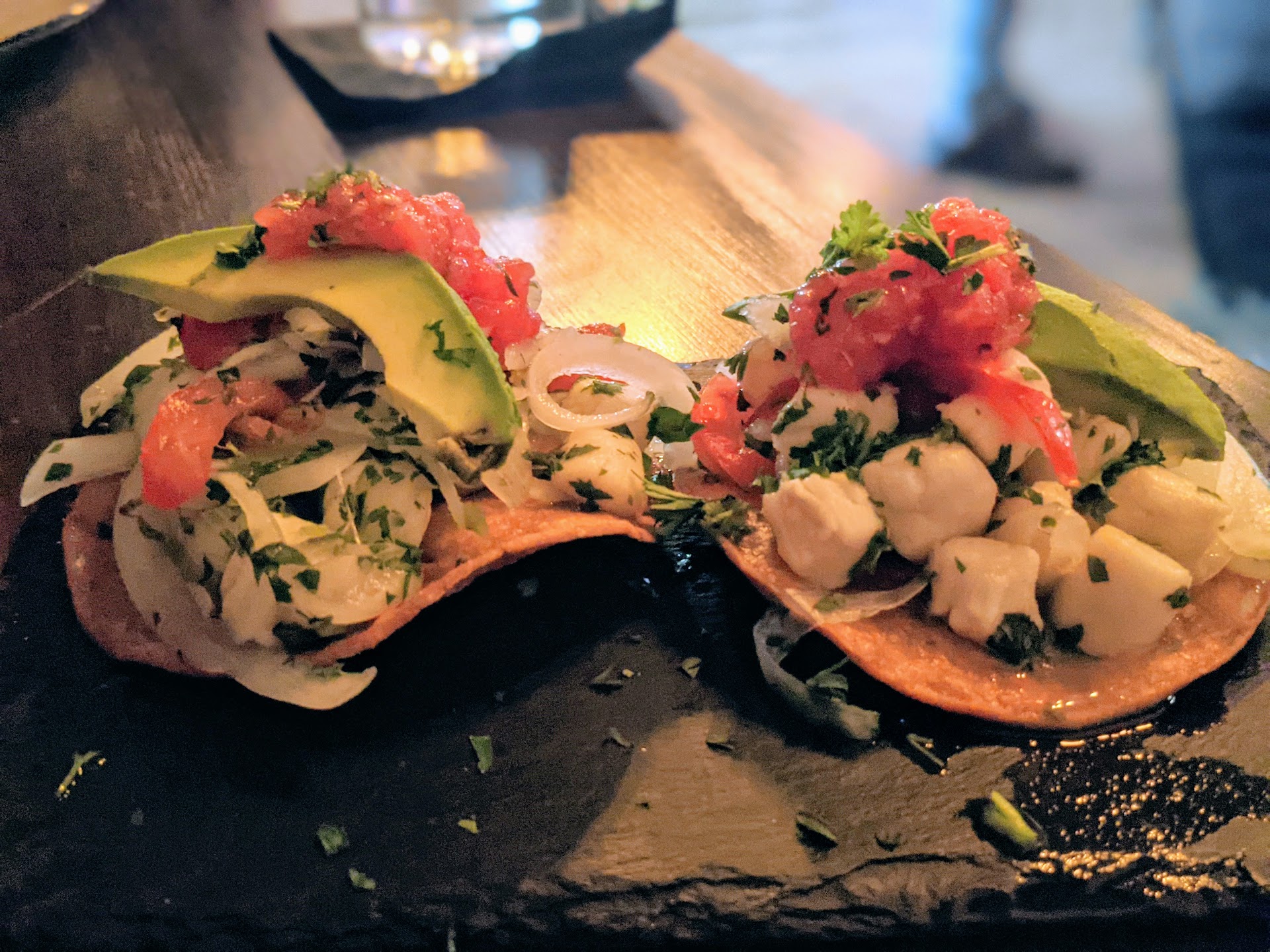 The fourth item, the chorizo tostadas, weren't bad, but way too greasy. We know chorizo can be greasy, but the tostadas were served on a small, flat piece of stone, and the grease ran down the sides and left a pool of grease in the middle of the table. Which the server left sitting there when he took the stone away.