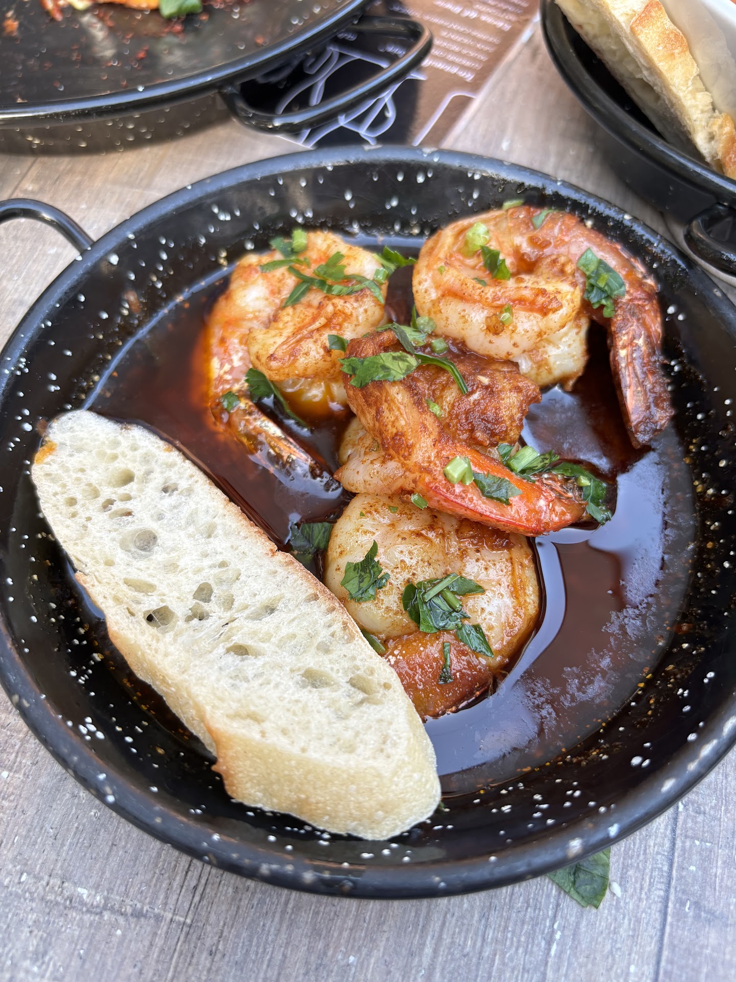 We ordered four tapas, only to find out they were out of the beef used in the Medalliones. So we ordered the meatballs, only to be told later they were out of that, too. So we got the Cordero Sliders, the empanadas, the chorizo tostadas, and the Chistorra. The Chistorra sausage was very tasty, but it was served with only one very small slice of bread, baguette sized. The photo on their online menu shows two slices of bread, and with the item ordered by a couple, one would think it would be served with two slices. It felt very much like they were cutting corners.