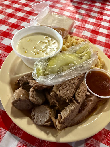 I ordered the brisket plate with a side of sausage. Service was quick but food was bland and unexciting. The brisket was very moist and tender, but essentially flavorless. No rub. No Smoke (or even a smoke ring). Bland dry sausage. The potato salad was good, as was the cream corn. Good but not Great or WOW! And while it is convenient, I don’t like the sliced bread in a bag or the pickles and onions. May be sanitary, but also feels institutionalized, which in my mind is not the ‘vibe’ you want. Even the potato salad seemed to have machine processed potatoes in very small clean cut chunks (bits may be more appropriate).