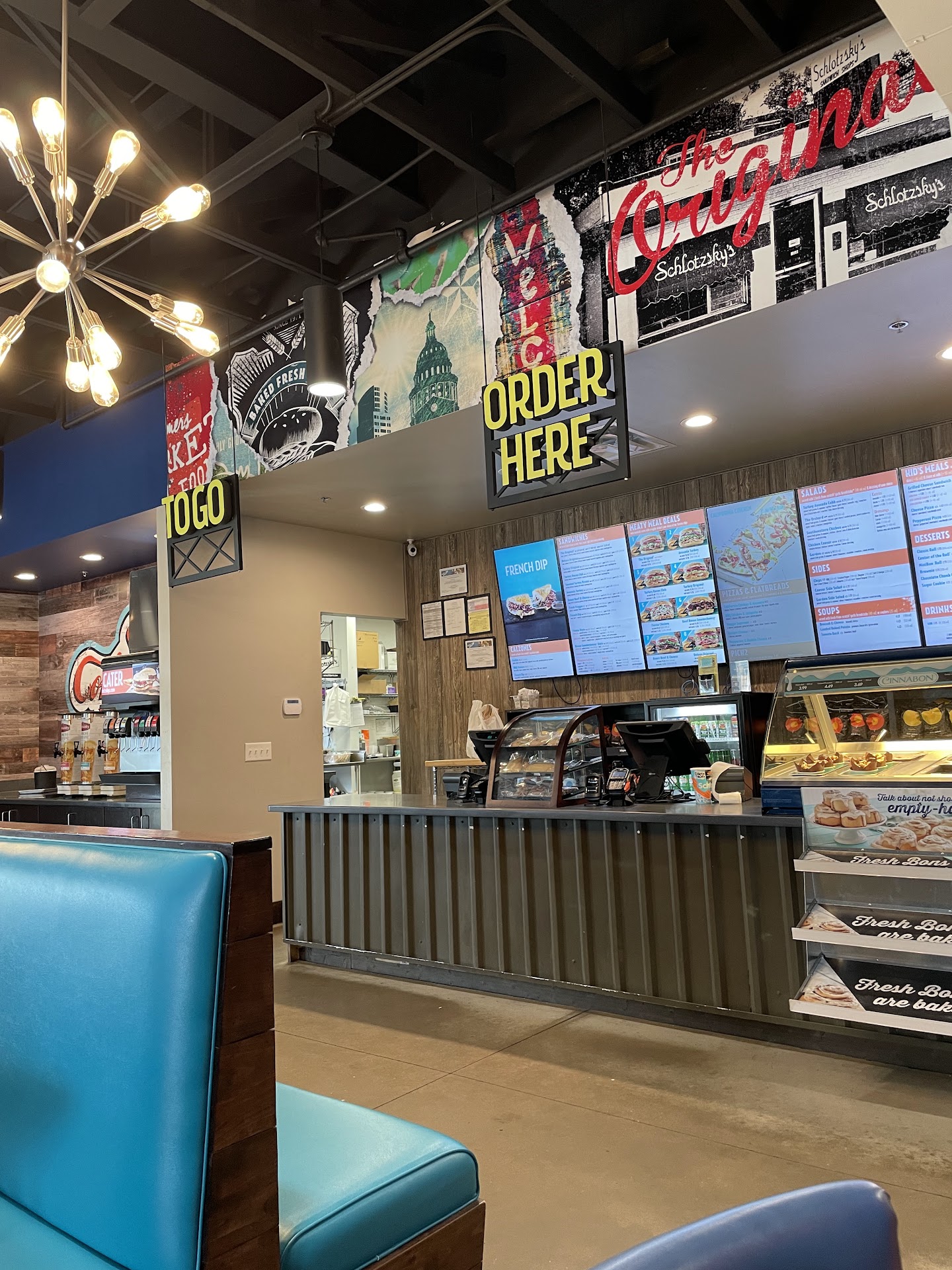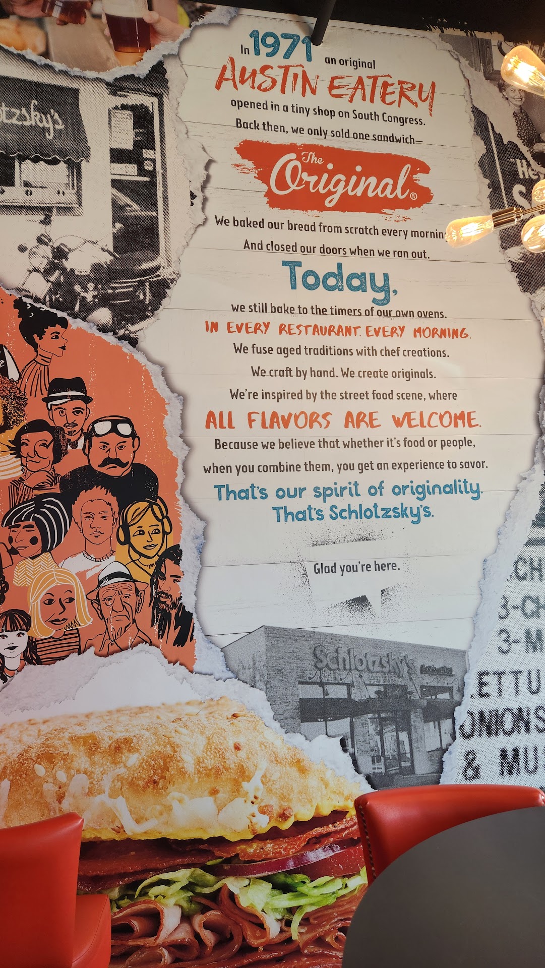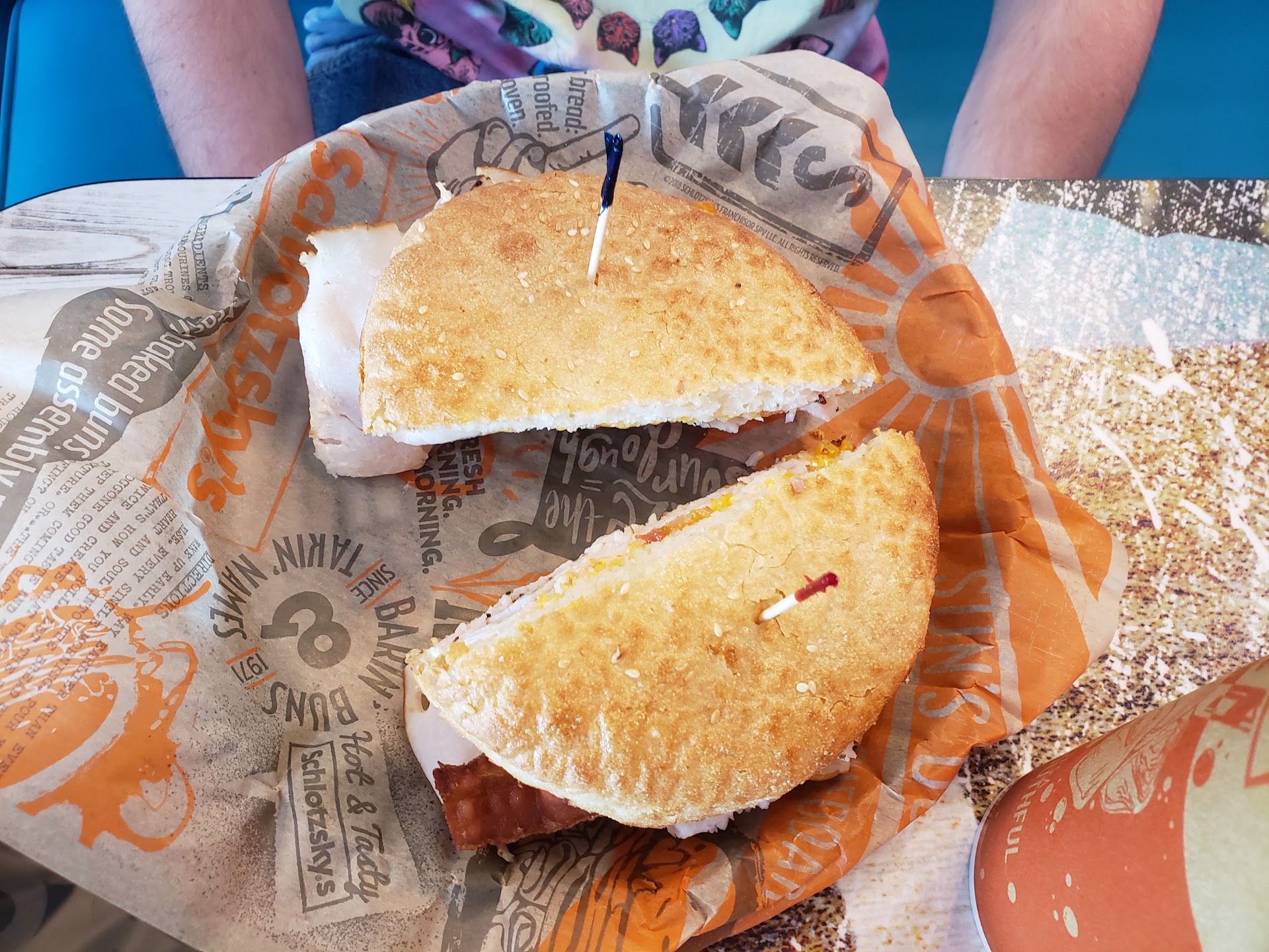 This was our first time at a Schlotzsky's. The menu is fairly simple and easy to read. The interior of this specific location was really neat. I asked the cashier what her favorite item on the menu was and she gave a few and explained why. I liked that. I ordered the Small Deluxe Original as a meal which comes with a drink and choice of their own brand chips. It was delicious but a tad bit skimped on the meat. My husband ordered the Medium Avocado Turkey meal. He said it was sorta flavorless and also not enough meat. My daughter ordered the grilled cheese kids meal which came with a fruit cup and apple juice and she surprisingly said that the grilled cheese tasted "weird" and she is definitely not a picky eater. Not sure about that. Schlotzsky's chips, jalapeno and original were very tasty. We would probably go back sometime on the future. It is a bit pricey on my opinion for a sandwich, chips and a drink but that's the norm these days...