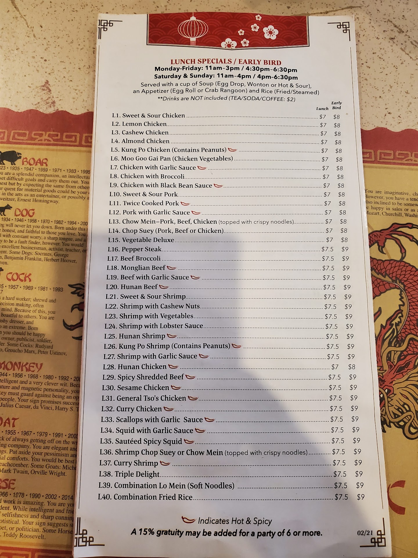 Read moreWe arrived at 6:15, and we were surprised that the parking lot was not full. We have gone in for pickup and enjoyed it. Because we arrived before 6:30 (now all those other folks missed out!) we were able to order off the lunch menu. That was a savings on the bill, plus we got Hot & Sour soup and an egg roll with our dinners. Every place is different, in Texas, I guess they eat later. We are recent transplants and we are staying at a hotel, and see people at breakfast, but we never discussed dinner with anyone. What is "normal" anyway? The food was delicious, the hot and sour soup had a great balance of spices and it was a treat! The egg roll was crispy and filled with vegetables. The star attraction was the meat dish, I had Mongolian Beef and my hubby has Spicy Shredded Beef. Both of us got steamed rice. I had enough leftover for my lunch today, and it was still great. Vegetables were still crisp and the sauce is still yummy. The rice was perfect. (I warmed it up in a microwave!!! That does not always go so well with leftover foods.) I would say that it is a worthwhile trip and, we will return. Just get the deal, arrive before 6:30, you will be glad you did. Oh, and if my fortune 🥠 cookie is right, in 3 months I will be extremely happy. Just sayin'. Watch this space July 10th is going to be a...