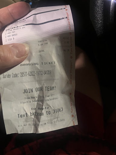Ā Ā Ā Read moreI wish I could give this a 0. I love Burger King but the experience I had here today was just horrible. Starting off with Jane cashing out a till irritated with the drive-trhou employee because she had to get out of there, so he has to take orders for two different customers at once. I ordered the two for $6 sandwich deal, two whoppers a large drink and medium fries. Total of 11.21, not bad for a meal for 2 right. Well I go get my drink there is no ice, but that's ok I can deal with that. I get my food and the fries look almost Orange and burnt... I can almost deal with that too. But I start eating my sanwhinch and there is a long blonde hair in it, and it is not mine and it is not my boyfriend's. When I got to the counter I told Jane what happened she said " maybe its your girlfriends" well no it's not because I have a boyfriend and he has black hair. She takes my sandwich to the back and has a guy named Jeremy come out he says " they are working on it Ok" I asked for a refund as my boyfriend told them the person making food should be wearing a hairnet as apparently they weren't at that time, Jeremy opens the till and gives me 3 dollars and some change but says he cannot give me a receipt for the refund and that he cant give me my original receipt because he needs to keep it. So disappointed and grossed out. And both Jane and Jeremy seemed to be the managers and they handled the situation very poorly. 0 stars for this BK. Oh did i mention they even had the kitchen guy come out and spy on...