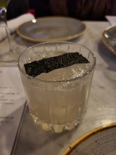 ATMOSPHERE: Tasteful presence of the music, loud enough to obscure neighboring conversation, but quiet enough to not require me to speak beyond normal volume. The music itself was not low rent pop or pop remixes, but truly pleasant background music of varying instrumentation I didn't recognize, blending electronic and acoustic notes. (This is important to me, as familiar music can break your focus in conversation on a date.) The bathrooms were unisex with several completely sealed, spacious stalls and a central sink area, dressed in marble, gold and beautiful mirrors akin to the lead...