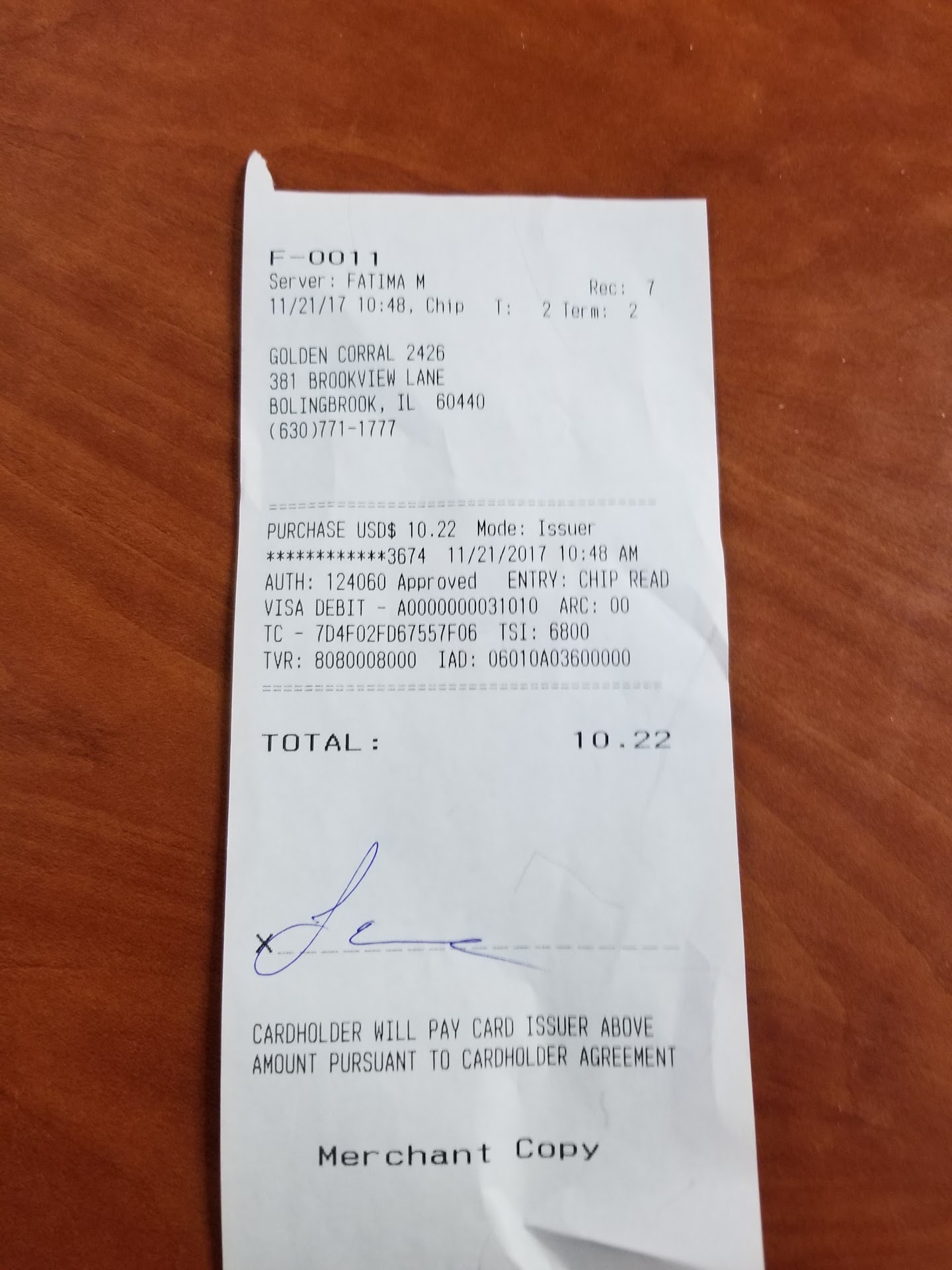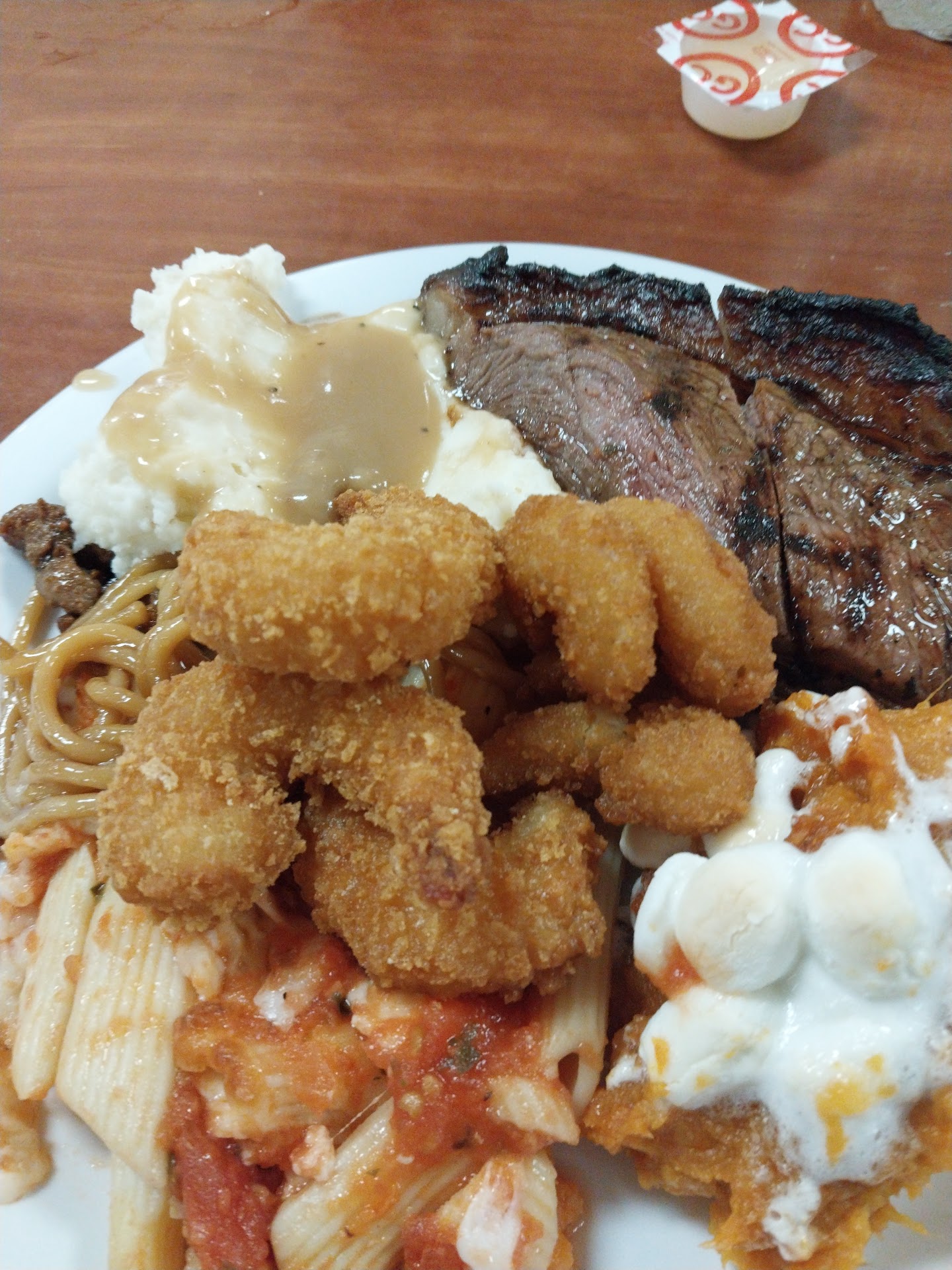 Read moreThe majority of food that we ate tasted like plastic. The spaghetti was watery and cold and the mostaccioli was also cold it had what looked like mozzarella cheese in it but it was so hard because it was cold. The mashed potatoes the Fried Chicken had an aftertaste that was not good. The sweet potato with marshmallows was cold and also had a taste like plastic. We couldn't figure out why everything tasted like plastic. Is it because the food is covered with plastic wool it is inside the heated containers that hold the food until it's needed to be put out? I was so sad and so is my family that this was a horrible horrible experience to have to have food to taste of this bad. This is the first Golden Corral I have ever been to that had bad food in cold food which was supposed to be hot I will be calling the Health Inspector to go check out what is wrong. We had diarrhea for 2 days. We will never recommend or go to this Golden Corral in Bolingbrook again. It should be shut down an inspected buy a health inspector before he opened again. This is not normal to be taste and plastic on food. The only food that I could say that tasted like food was a piece of steak I had that was cooked medium but it was too tough to eat and some little tiny breaded shrimp other than that the food was horrible I usually never never give negative reviews especially this bad of a review. But it was awful and getting diarrhea for 2 days was awful also. We were wondering why on a Friday night it's 6:00 p.m. if the parking lot was empty and the restaurant was half empty. That should have been a clue for us. Now we know why it was half empty because the food was not good. I truly believe we got food poisoning because we both had diarrhea for 2 days. As you can see in the photo most of the...