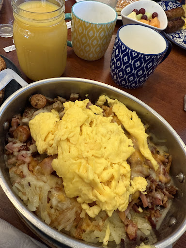 Our waitress was sweet and friendly and took our order promptly, but the food took 45 minutes to arrive. When it finally did, my order was wrong. I had ordered the California omelette, but they brought me something entirely different, he said the “fig and bacon”. When I pointed it out, the server just said, “Oh yeah, the California,” without even checking. On top of that, the omelette was missing key ingredients like the avocado. They also never brought syrup for my husband’s French toast and pancakes.