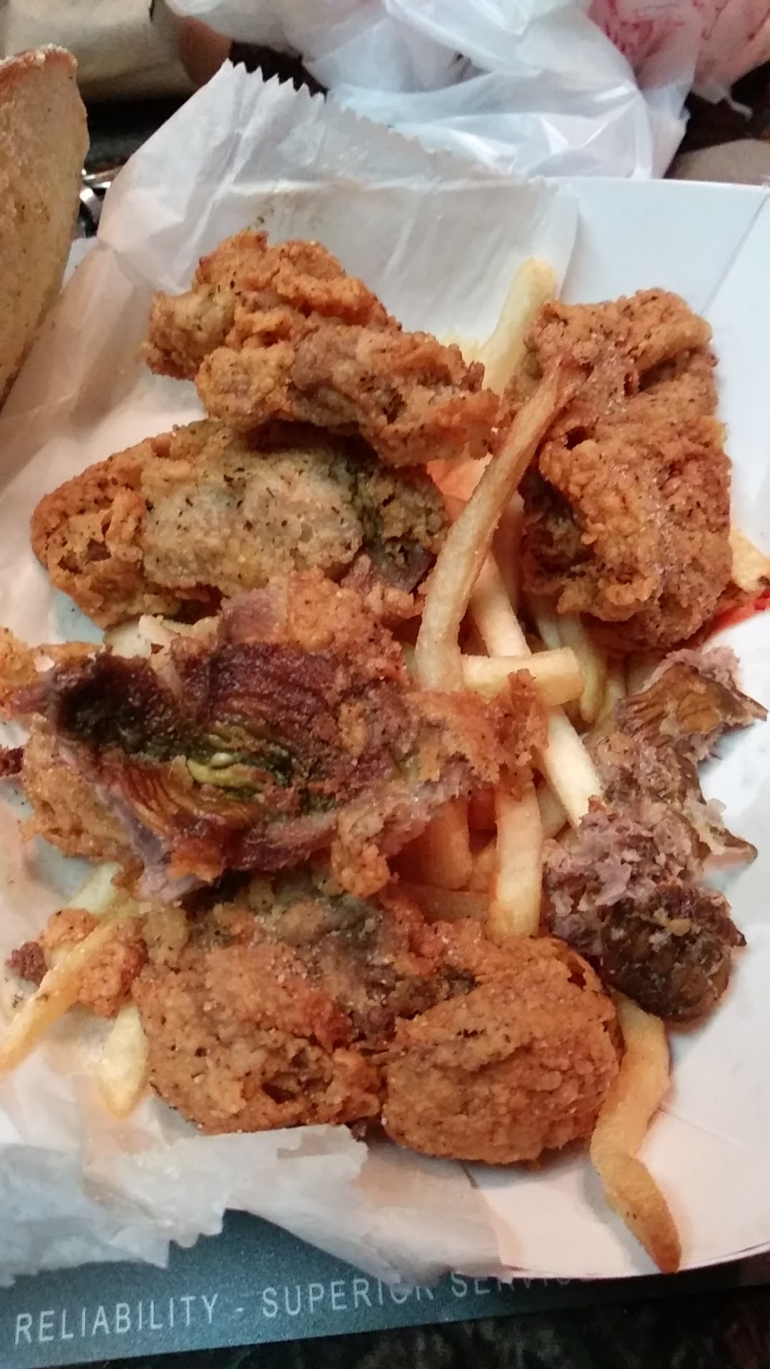 Ā Ā Ā Read moreI ordered the small combo fish n shrimp and 4 pc leg n thigh chicken. Total was around $27.00. The smell was so foul from the bag i didnt even want to open it and almost puked at the strong scent. I opened the bag and the smell got a little better because it dispersed into the air or something. Chicken was over fried, way too much coating on top, chicken inside was dry as hell and you can see the blood. Tastes like something i cant even describe, one bite and i spit it out and had to drink something right away to take away the awful taste. The breaded fish was ok but too salty, the shrimp were ok too but something was off about them i cant pin point what exactly. The fries were super basic. The coleslaw was disgusting. Overall 0 stars, believe it or not i took one bit and tossed the whole thing into the trashcan nearby. Never coming back again no matter how...