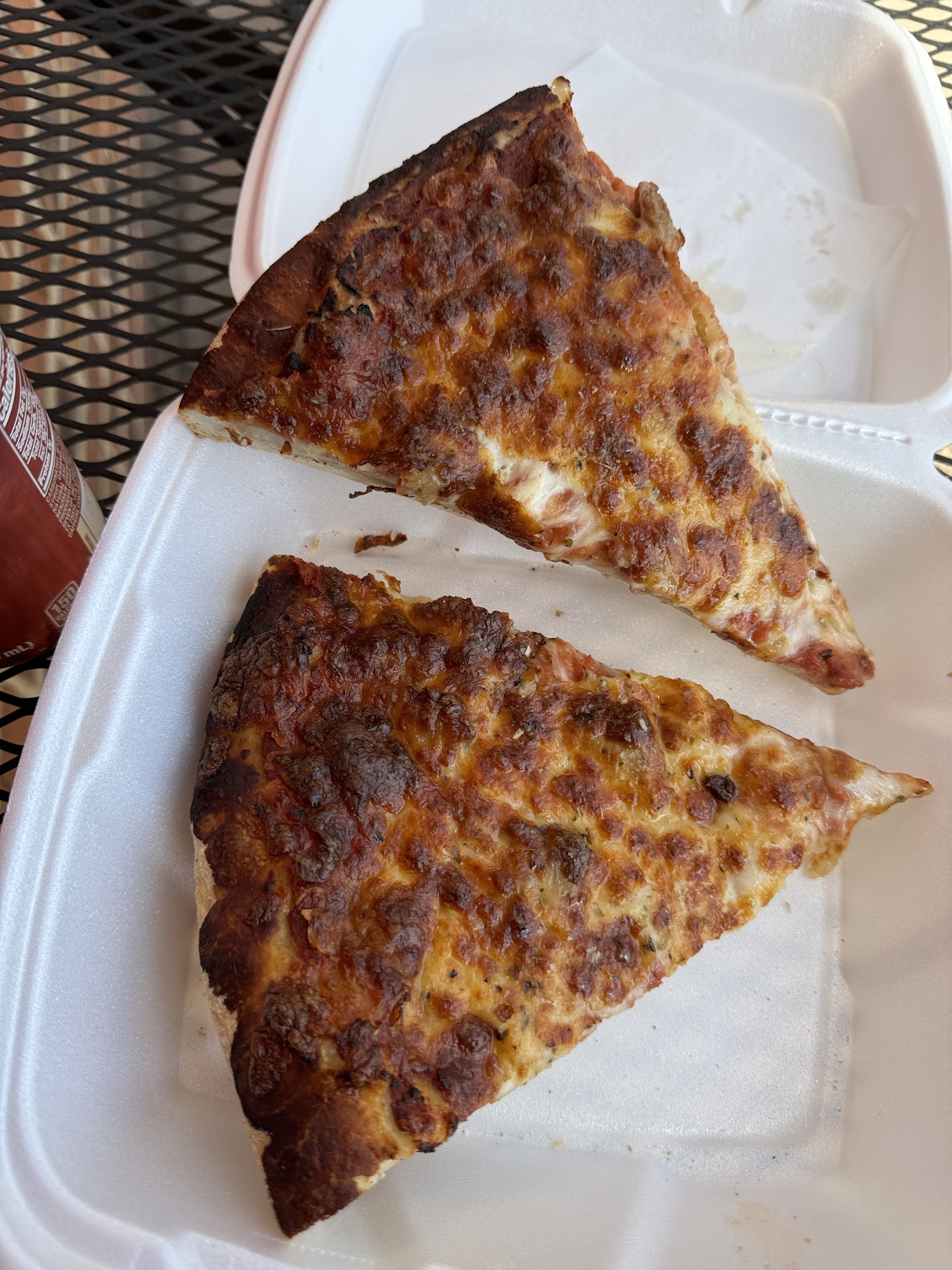 Anyway, I'd still support this place. I love local shops where you can get a decent slice. And this place itself is just a small little shop, with quite a few tables in there and a basic television where you can just kick it and take a break. The place definitely has character. Of course, the pizza itself is great. That's my opinion anyway. I usually stick to the standard plain cheese or pepperoni. It's definitely on the heavier side, with a thicker dough/crust base. And with that said, I still think it's worth the cash....