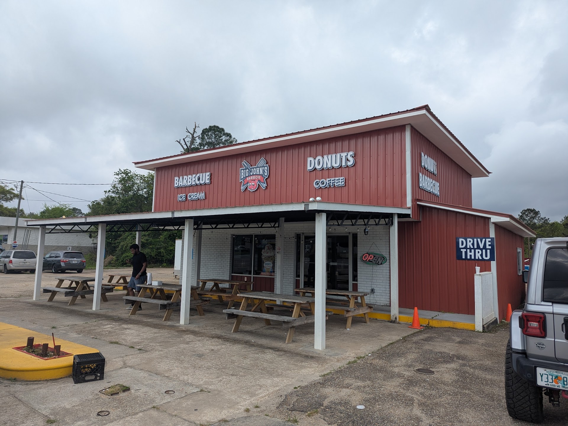 Smash burgers were delicious! My family and I stopped in here on our way back home after a day of swimming at Vortex Springs. It's a small little spot with a few inside tables and a couple of picnic tables outside under a small covered area. They offered ice cream, doughnuts, smash burgers, hot dogs (with several toppings available), pulled pork sandwiches, shakes, seasoned fries, chicken tenders, and mac n cheese. The ice cream and shakes were good, but the smash burgers... absolutely delicious! They were fresh and perfectly cooked. Especially after a day of being in the water. The service was ok and the girls were very friendly but they seemed disorganized. I think they just needed to slow down and focus on one task at a time instead of bouncing all over, trying to do too many things at once without completing one. The restaurant area isn't very big, but there is a drive thru. However, the burgers were...