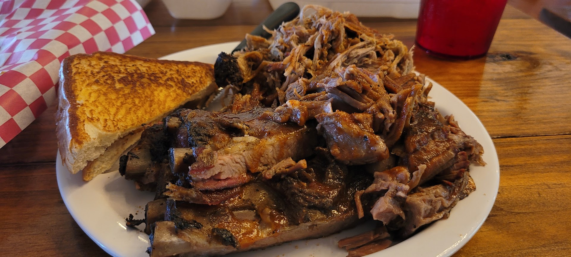 Read moreWe chose to eat here tonight based on all the positive google reviews we read. I feel like we are pretty easy to please and I love to support family owned local restaurants instead of a chain when we travel. The food here was just not good at all. There were 9 people in our party. We got 2 sampler appetizer platters and those were okay. The fried pickles were actually really good. I ordered a 3 meat platter with ribs, pulled pork and brisket. There was a $4 up charge for ribs and &3 up charge for brisket. My biggest issue was the brisket was 100% NOT brisket. It was a roast. I know what brisket is, the texture and the taste. This was definitely not a brisket. It was a much cheaper roast being passed off as brisket. The pulled pork was so-so and the ribs weren’t great either. The mac and cheese was so mushy and flavorless. One person in our party enjoyed her salad. Another said their burger was good. Our son’s chicken strips were burned. I hate leaving negative reviews but this was just not good and a total waste of money as we left most of the food at the table uneaten. I do have to say that the service was quick and very friendly. I did not complain to anyone. The people were nice and I didn’t want to try anything else. We did get there later, about an hour before closing so I don’t know if that made a difference. I doubt it with the brisket. I feel like that was just deceptive and they were just trying to make more money. I would not recommend...