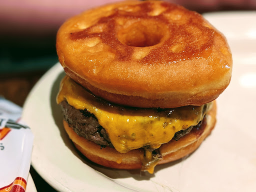 The donut burger is sticky, but a sweet pairing with the savory burger: the bacon adds a salty compliment, but ask for the bacon to be more well done so it doesn't turn into a slip 'n slide sloppy mess while eating the burger!