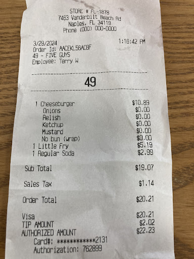 Read moreFirst review after many visits. I and my family of five total people have eaten here for four years. Havenât been since early 2022 but I went for lunch today by myself. A double cheeseburger with lettuce wrap, small fry and small soda was 22.23. Five guys like everyone has decided to engage in fakeflation and surrender to greed and milk their customers; middle class people and families. Donât get me wrong itâs delicious itâs fast the service is good the staff is awesome.