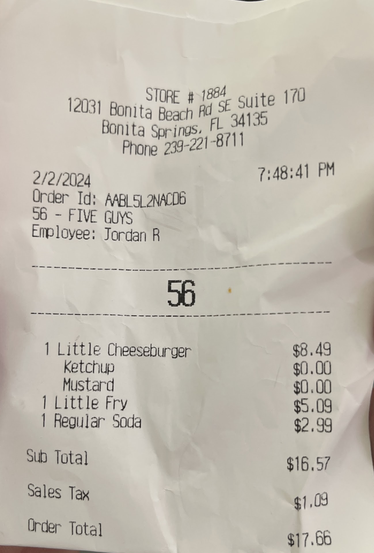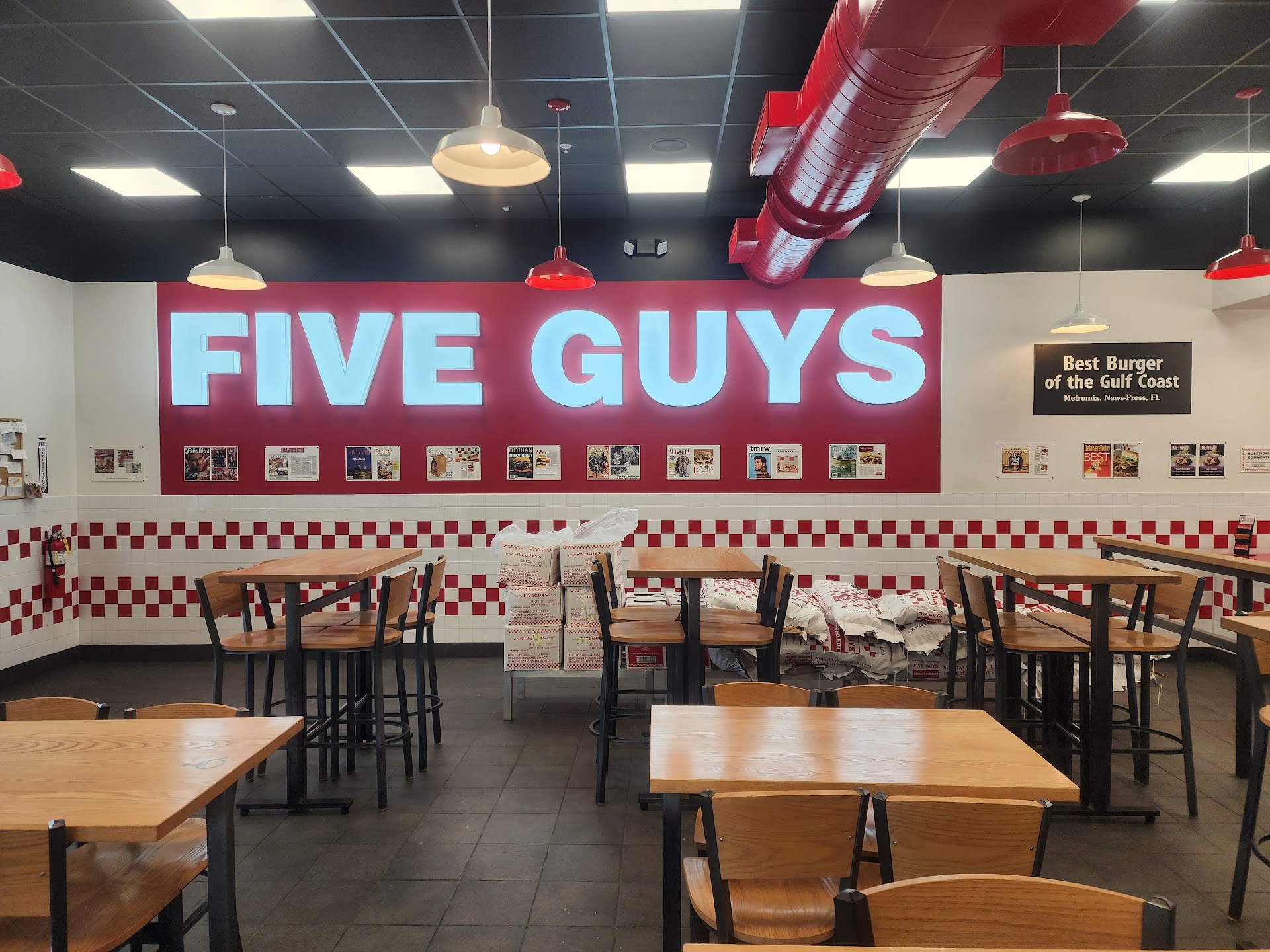 Read moreI ordered online to be picked up inside at a specific time so I got there 5 minutes early and when I came in the staff said hi to me and asked if I had a pickup or dining in I said pickup and gave my name and they were already working on my order and kept me up to date on the progress. It was ready on time and all the staff was so friendly and helpful and went over my order and made sure everything was correct and asked if I needed anything else. All in all was an excellent experience and I will highly recommend this Five guys and will be coming back. Food was excellent with exceptional service my only regret is I didn't get the staffs names so they will be recognized for...