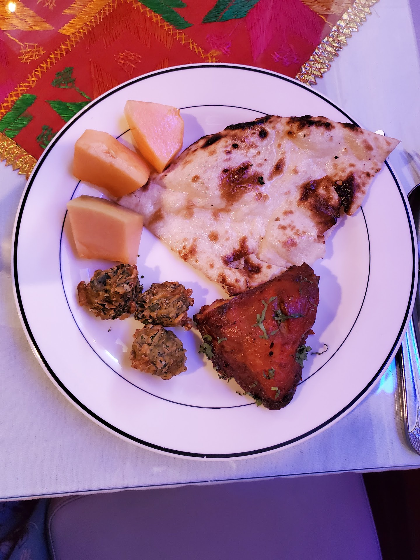 Our order was taken for food and drinks. We ordered the dinner for two, which includes a soup, fried appetizer platter, two meat entrees, rice, naan, desert and tea/coffee.