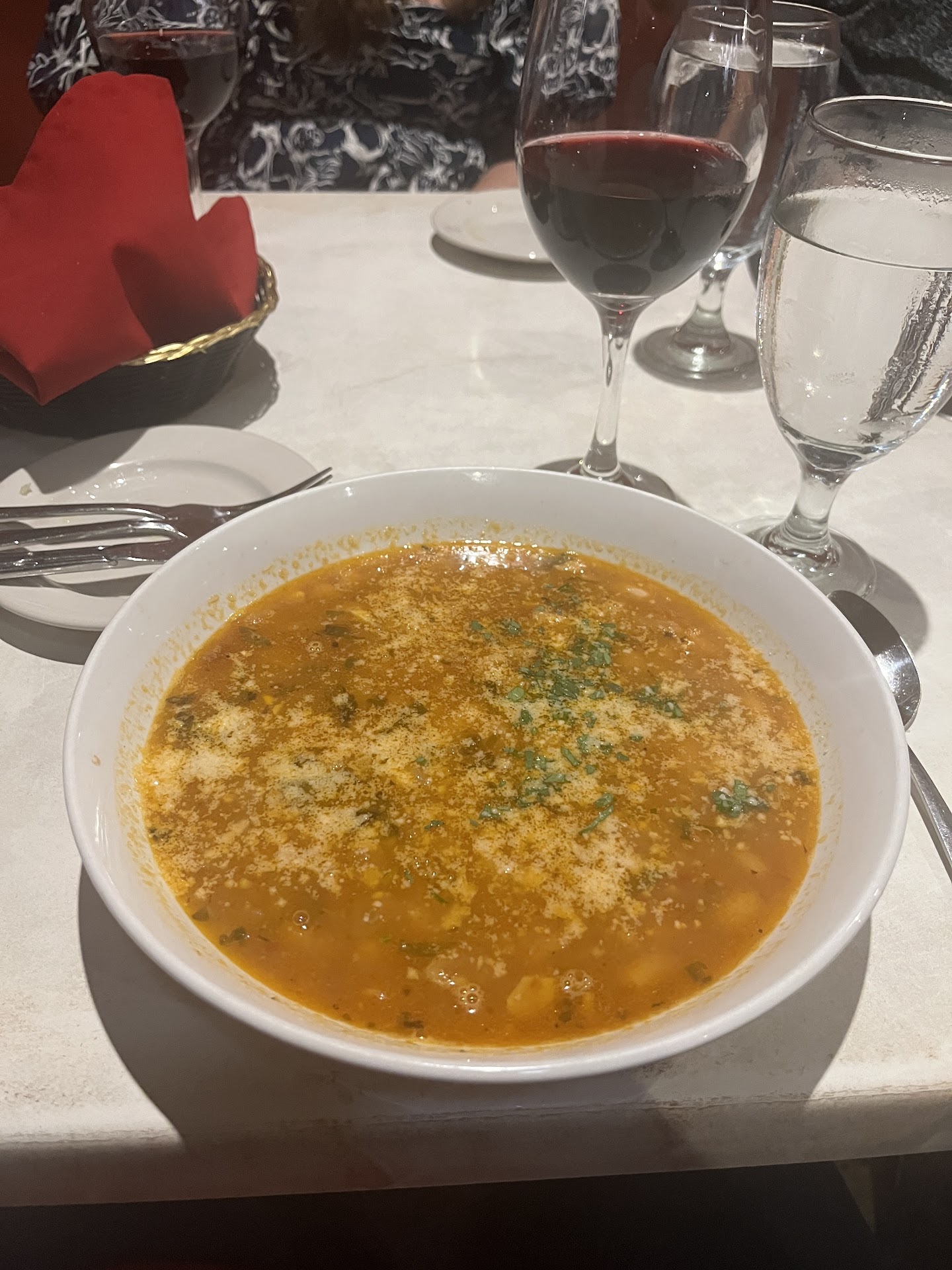 Husband took 1 bite of the veal. Then he took a 2nd bite to confirm his suspicion that the veal was either very old or possibly spoiled. Wanted me to taste... no way!! I wasn't going to get food poisoning. He eventually got the waiter's attention, told him about the weird tasting veal and asked him to take the plate away. He then ordered a bowl of pasta fagioli...a simple bowl of bean and pasta soup...for $18!! Ridiculous!!