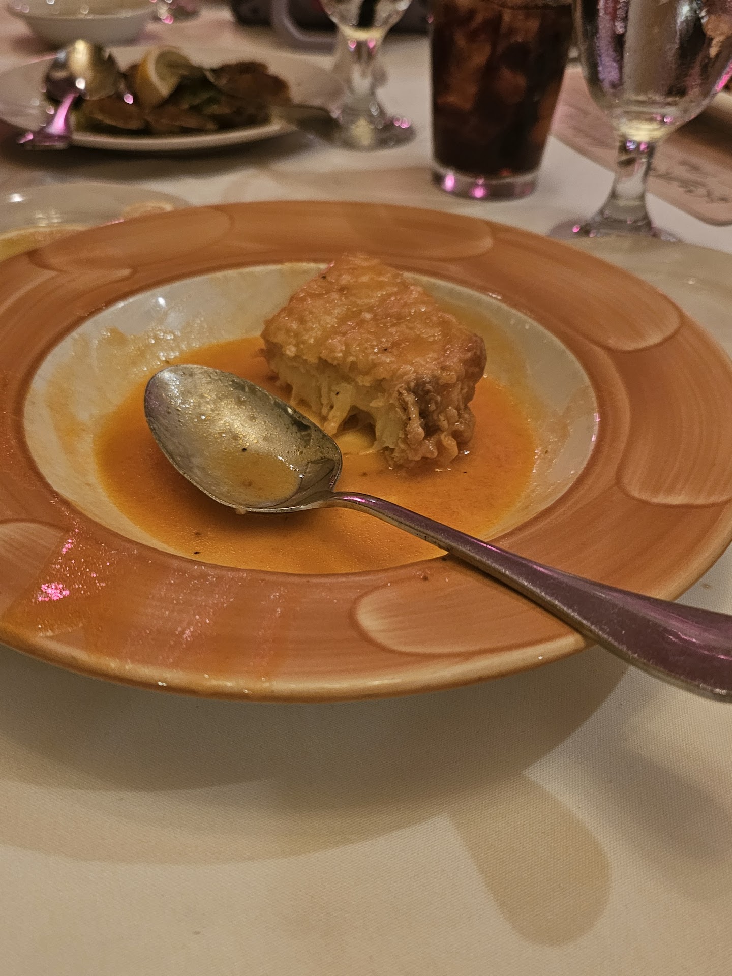 Unfortunately, my husband (sitting at the other end of the table) ordered the veal saltimbocca. Guess he was a glutton for punishment after our last time eating here. The veal was SWIMMING in some sort of gravy. Husband mentioned to the waiter that he didn't see any prosciutto. Waiter indicated it was under all the gravy on top. So my husband scraped the gravy off and revealed a teeny, tiny piece of prosciutto stuck on top of the veal.