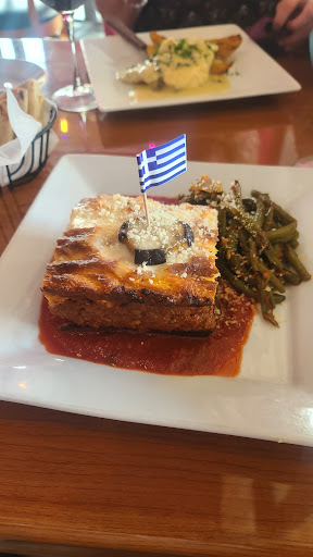 I ordered the Moussaka, of course. Potato, zucchini, and eggplant layered with our Greek meat sauce & 3 cheese blend. Topped with a rich, fluffy béchamel. Served with green beans stewed in tomato sauce.