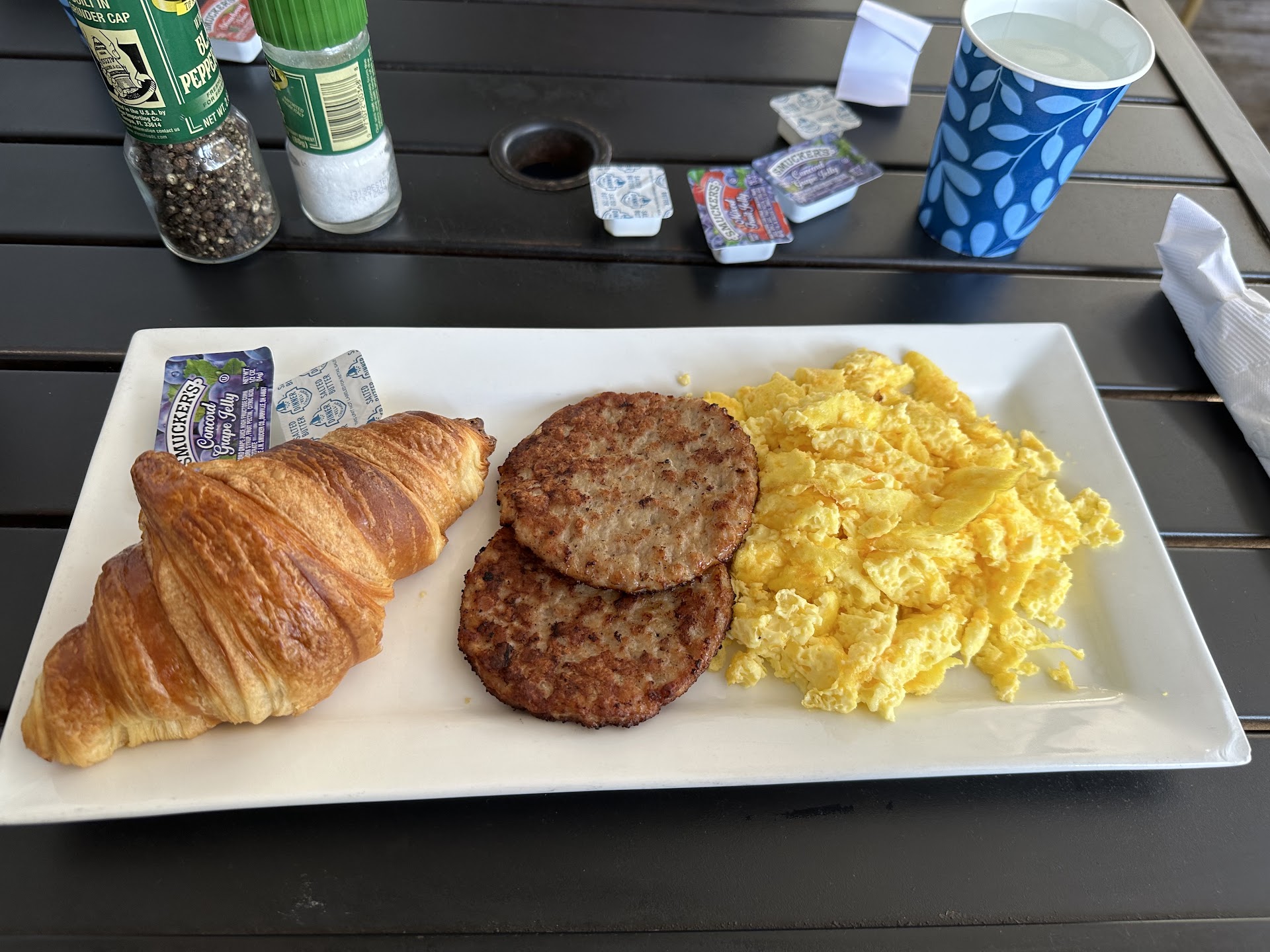 Drinks? I had to fetch my own coffee, served lukewarm from a giant tank like I was on dish duty at summer camp. The wife? A "Dixie cup" of water—because hydration is apparently rationed here—which I had to refill multiple times like an unpaid intern at my own meal.