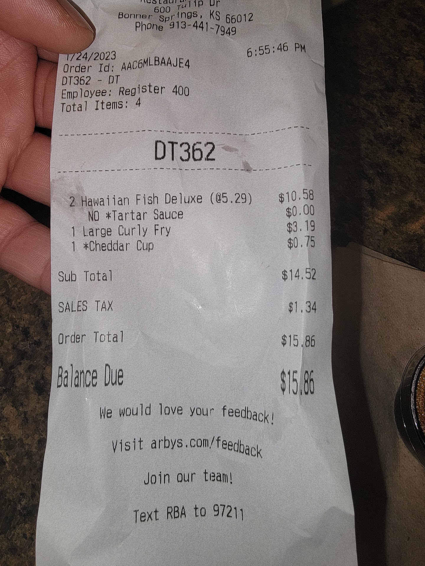 Read moreMy wife ordered the Smokehouse Beef Short Rib w Cheese and I ordered the Smoke Mountain w Cheese, we couldn't figure out which one was which and had them half ate before we saw the secret code on the packaging. One didn't have any cheese and neither looked like the picture. Order came to $21.72, I gave cashier $22 and she gave me a quarter. I guess they round up to nearest quarter. Ice machine at soda fountain didn't work. Ketchup dispenser didn't work. Didn't get a receipt and wasn't offered one so couldn't do online survey for a chance to win $1000 or to voice my dissatisfaction. No doubt the cashier did the survey for me. The Smokehouse Beef Short Rib had tough chunks that I couldn't bite off so had to rip the whole chunk out of the sandwich and choke it down. Also it was very messy to eat. Wouldn't get it to go for the road. The Smoke Mountain was OK, would be better on something other than Texas toast and the onion rings were mushy. The chocolate shake was great and the curly fries were good and the place was clean and...