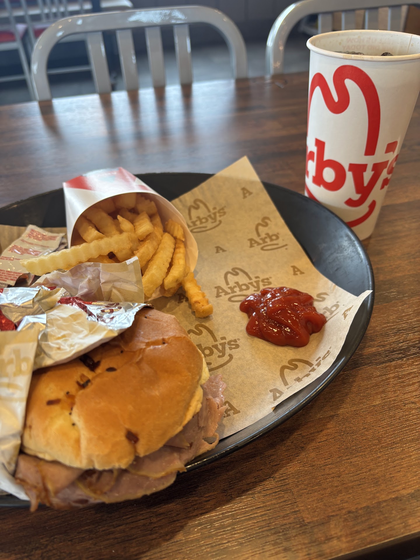 I went to Arby's for the first time in years because a roast beef sandwich sounded really good today. I haven't been to one as a local chain in years because my experiences have been so lousy - and Arby's is too expensive to have a lousy experience. But I thought today, I would give it a chance. I ordered a Double Roast Beef meal with an iced tea. The girl at the register and the window was very nice, but my meal was disgusting. I ended up just parking in the parking lot to eat it because I wanted it to be fresh, but the sandwich was already cold. I mean, cold. I pulled it out of the bag and the foil was cool to the touch. And it is 95° outside. For it to be cold, it would have had to have been sitting out for a long time. The meat was thickly cut (and jagged) and sloppily placed on the bun. I decided to bite into it, and it was hard/dry. The fries were mostly crumbs - not a true curly cue fry in the box. And my iced tea tasted weeks old. I opened the cup to find what looked like river water in my cup. And really, it was just too hot today to deal with going back in line or into the store to complain. I knew I wouldn't get a better replacement. I threw it all back in the bag and tossed it when I got home — $9.37 down the drain. I won't go back to an...