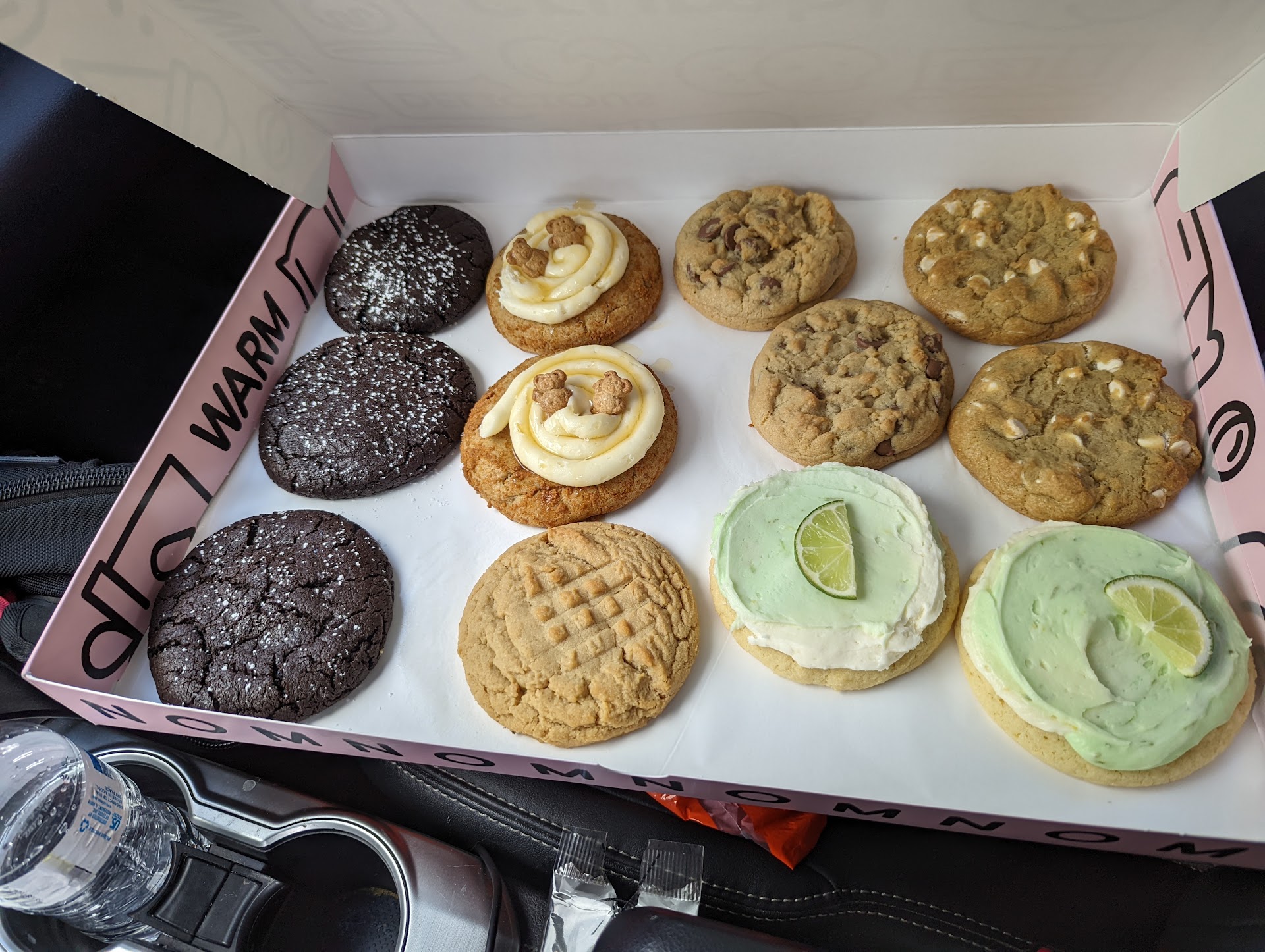 I stood in a line of 15 people waiting to make an order and 6 people waiting to receive their order. It's busy, that's fine. However, not a single one of the 4 employees there said a word to anyone. No "hello, bare with us, it'll just be a few minutes, we are waiting on the oven." nothing! They were serving stone cold silence. The 2 front cashier ladies seemed overwhelmed, facing the back wall clicking through the online orders and loading box after box for delivery, without taking a single order from the customers actually in the building. Delivery drivers came in, one after the other, squeezing through the crowd and taking their orders to go, and the staff continued packing cookies for more delivery. The first customer in line decided to order online for pick up and wait in her car, hoping to get better service. 2 other people walked out before they finally took the first order of the line from us...