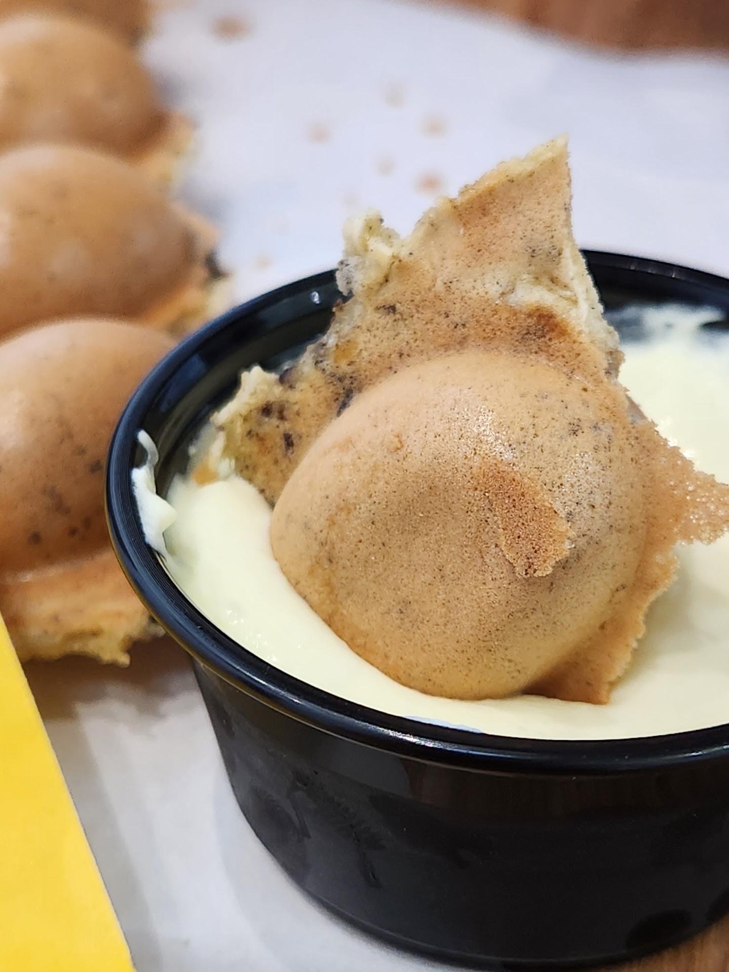 It always makes me a little nervous when a restaurant is labeled just "okay" on their little posted inspection sign. We popped in here because we were visiting the chiropractor next door so that is convenient but the parking here sucks. You almost have to park in the lot across the street. The setup is odd because where you line up to order/pay is where they have the garbage cans so when we were done, you have to go around people. It would have been better if they put it on the back wall. It is pretty small inside so you couldn't have it very big group here. There is also a small table and chairs outside but the cement is so reflective that it is pretty hard on the eyes. The puffle was VERY good though they gave us the wrong dip. I wish they had more selections for dips beyond the creams. A similar place we have been to that sold puffles had mango which was delicious. This is a small thing but I wish they didn't print out the order directly on the front of the puffle packaging. It's kind of like when you go to Starbucks and there are so many people they don't know who ordered what. They don't have very good descriptions of what the items are, so it's worth it popping onto your phone so you can see the menu better with pictures. For example, I didn't realize my drink had boba which isn't my favorite. Also my son's melon lemonade was really sour and had a slightly odd taste to it that we dumped it out when we got home. Next time we are going to do more research ahead of time...