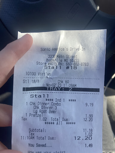 Read moreMy order was received quickly (within 1 minute) by a friendly voice. From order time to the time I received my lunch (this was during the normal working lunch hour) was approximately 6 minutes. My carhop was incredibly courteous, and delivered me a perfectly packaged burger that was made with consideration. My fries were hot and crispy, and the meal was put together very well in the bag as to not have any loss of fries. I did not ask for them, but the greater than 2 napkins was graciously appreciated. I do not eat fast food often at all and don’t have convenient access to Sonic, but I would say this was the best Sonic experience I have ever had. You all are doing...