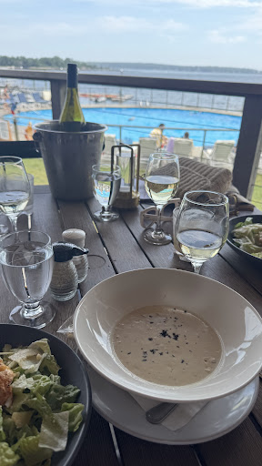 It is definitely a nice place, waterfront with the availability to come and dine from the sea. The terrasse is ok with nice view and the main room looks nice too, all wood built and looks cosy. The restroom are a bit weird behind the bar with the windows (covered by an almost dark curtain) with direct view on the main entrance but very clean.
