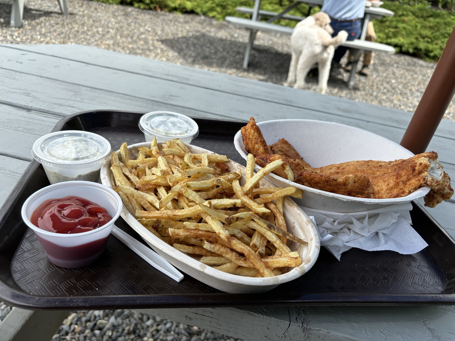 My favorite place to get fish and chips! I had a hankering and decided it was time for my first visit of the season. I feel like I recall that they used to do half portions, which is no longer the case… so let it be known that the portions are incredibly generous! A fish dish with a side of fries will easily be enough for two adults with average/normal appetites… and as such, I wound up with leftovers. The fish is always fresh, sweet, and oh so delicious, and their shoestring fries are perfect! I recommend getting both sauces with the fish. Rhe service is always very fast. Parking is weird, but that’s always been the case. Cash or check only, so be sure to bring enough money for food and tip! Prices on the menu already include the tax, so no...