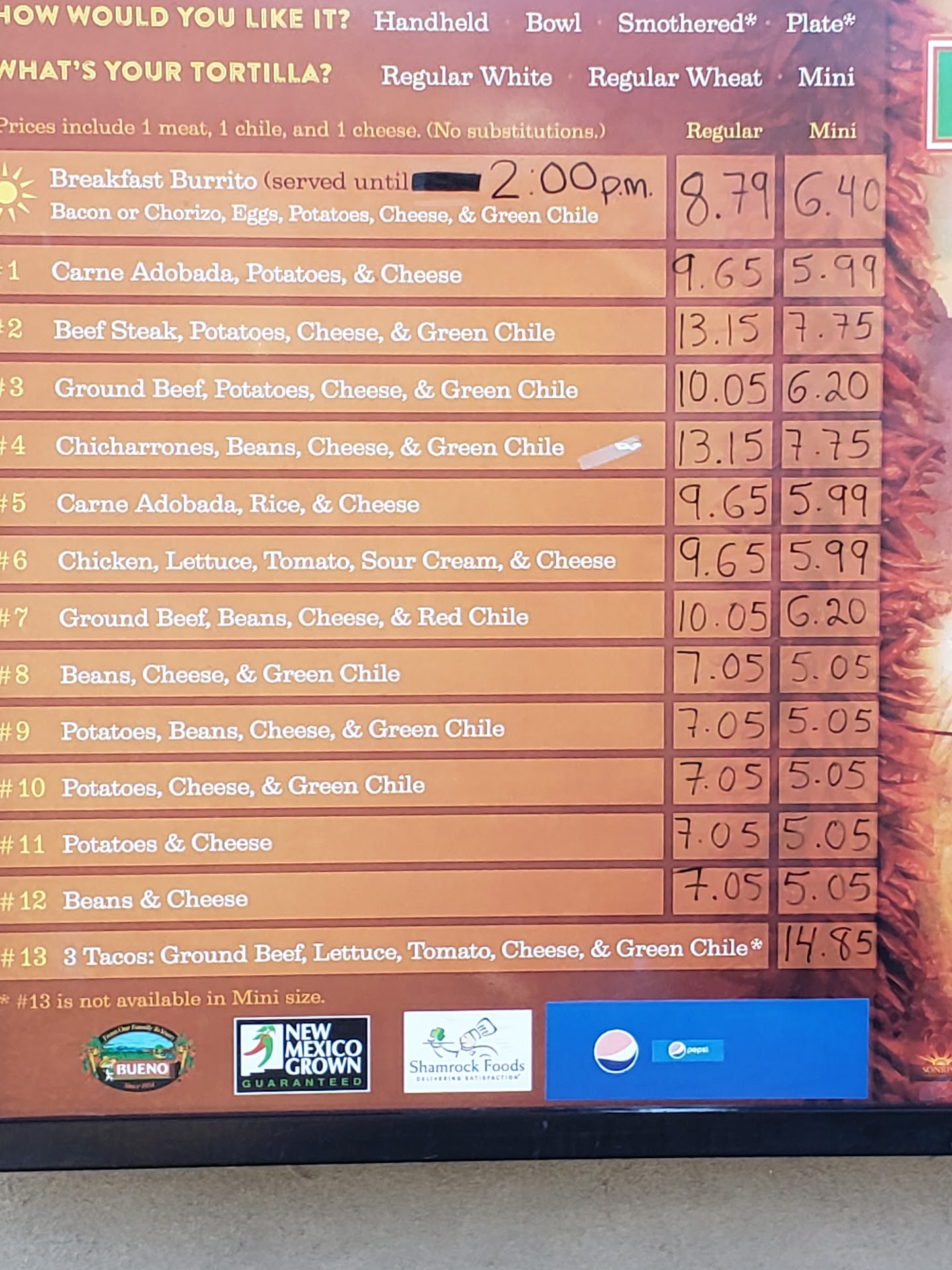 Read moreFor $14 a burrito, this was insane!!! In the past, a #2 steak burrito contained cube steak, diced potatoes, green chile, and broth. Cube steak is the cheapest steak cut you can get. This last time, they gave me 2 shredded potroast-style burritos, for $30!!!! And im telling you now, THEY CANT WRAP A BURRITO. It's insane how they give you a soupy, wet burrito, folded over twice and the end is just bent up. How you gonna be a burrito chain in NEW MEXICO and not know how to fold a burrito????