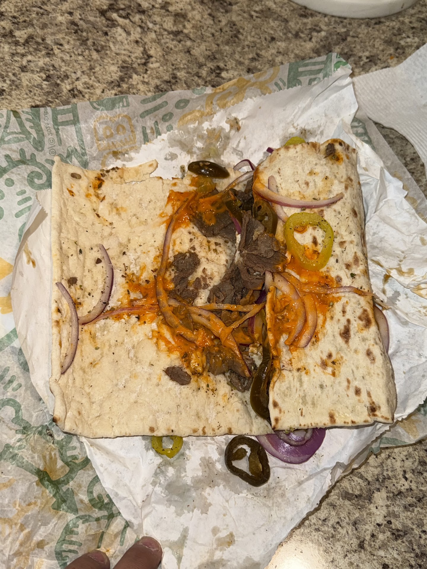DO NOT GO HERE!! Guy behind the counter needs to get fired ASAP. Shocking to see the reviews of other people having similar experiences. My wife ordered a footlong on flatbread and this is what she got. I went back to get it remade and I guess the dude thought we ordered a wrap in a flatbread. I get him to remake it and he makes the sandwich the same way (not caring about how the sandwich looks or what’s on it). I physically show him how to make the sandwich on the counter with the second messed up sandwich and he precedes to make a 3rd sloppy sandwich. It’s one thing if he didn’t know how to make the sandwich, but his attitude towards the situation is what did it for me. Comments like “do you want to make it” and “I don’t care” towards customers that paid for a product are inexcusable. This guy does not want to work there and shouldn’t be. This is only half of it. I plan to tell the rest to the owner/manager when I ask...